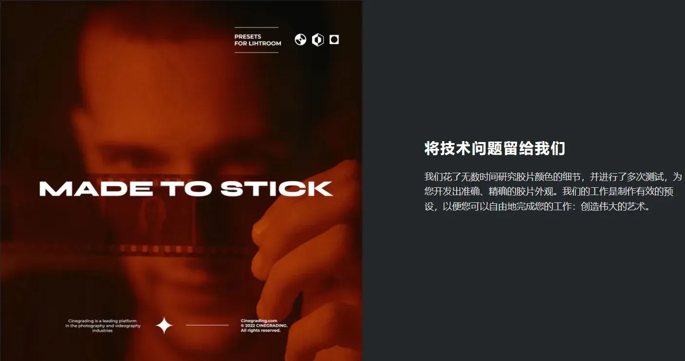 10 个预设,10 种不同风格,1 个套装。专为重现电影美学而设计。节省时间和精力,用令人惊叹的预设取而代之。按需拍摄电影,您只需单击一个按钮即可。 轻松调整,无论您是想要微妙的效果还是完整的电影效果,我们都能满足您的需求,只需根据您的喜好调整级别即可!更不用说您的亮点永远不会被剪裁,始终保持质量。