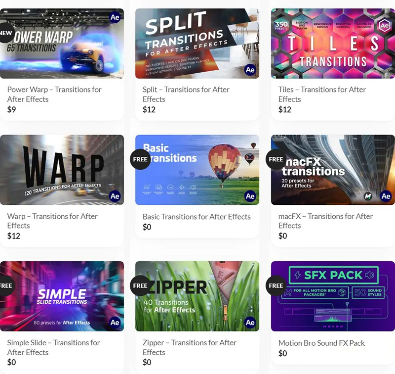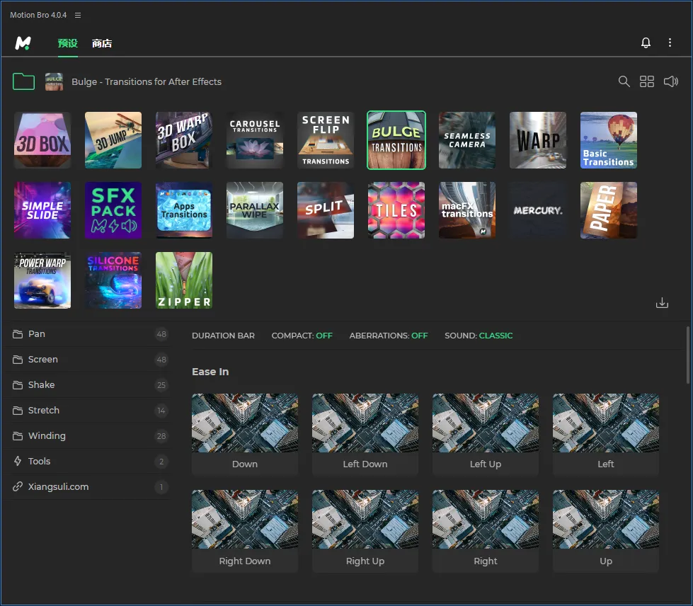 这是一套Motion Bro 脚本预设合集包,包含20种类型的转场预设和1个音效素材,共有5000多种效果预设,由Motion Bro 4.0.4 脚本扩展可视化效果预览。选择需要的效果双击即可生成,使用非常简单。
