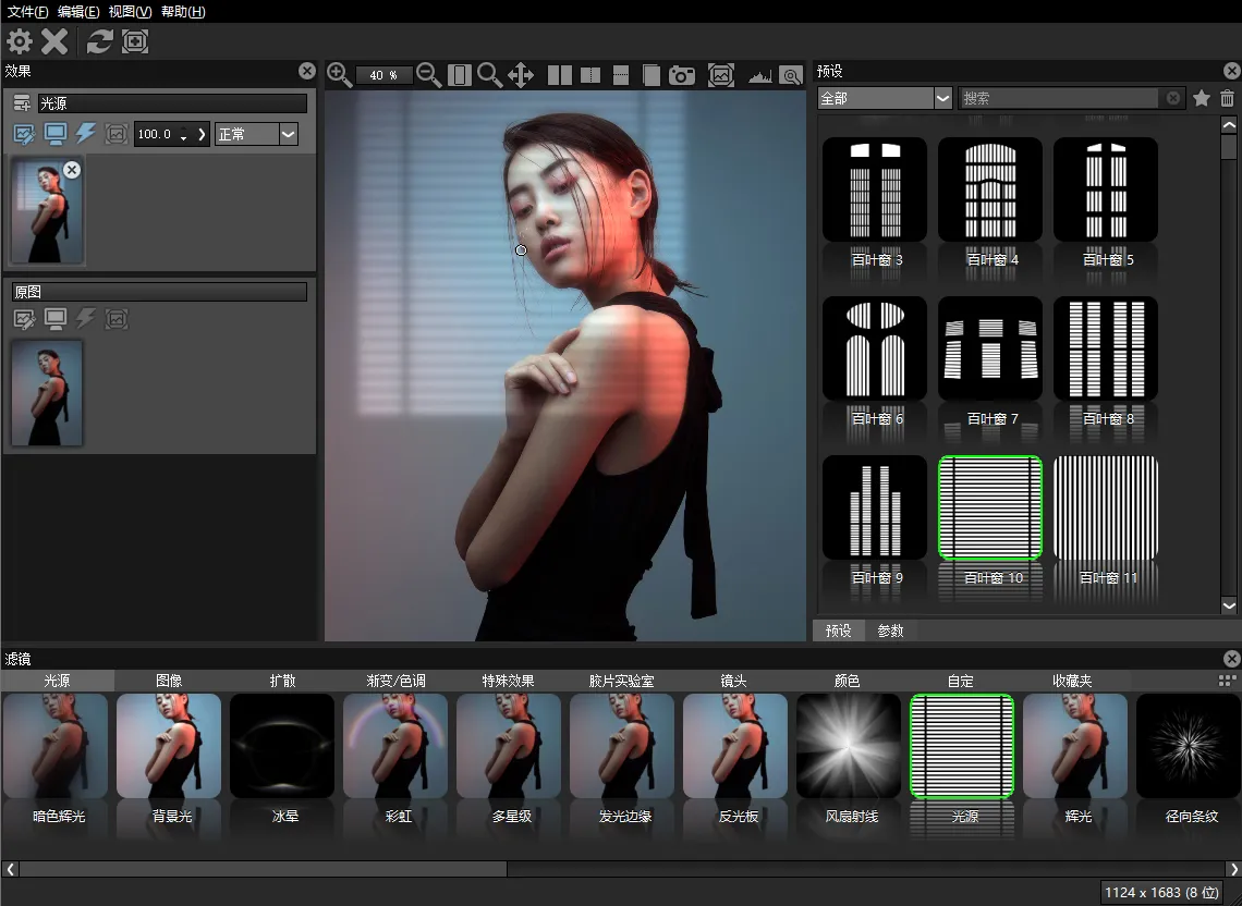 - Lighting 光效:331个光学镜头光晕预设:变形、圆形、多边形、星形、树形和程式化等,193种不同的照明效果,可使用在你的图像上。751个图案照明效果:抽象、门、元素、树叶、雪花、纹理和其他。