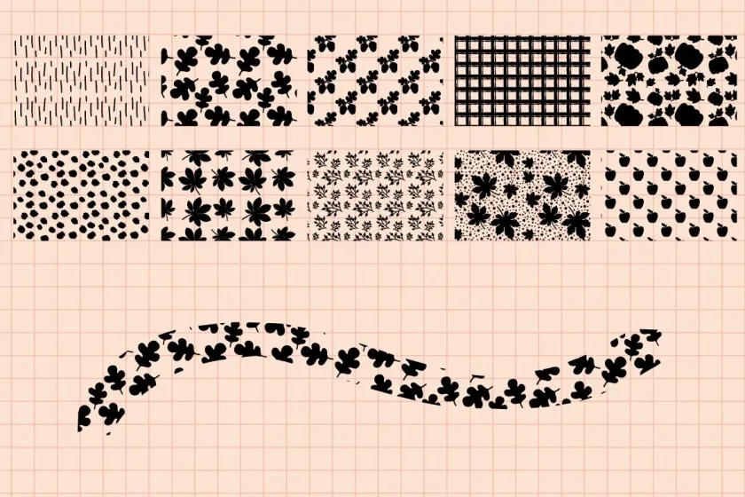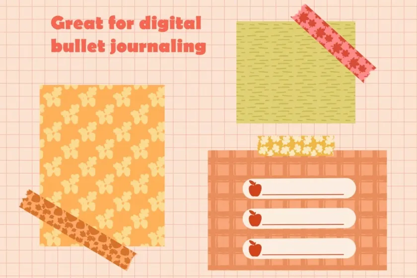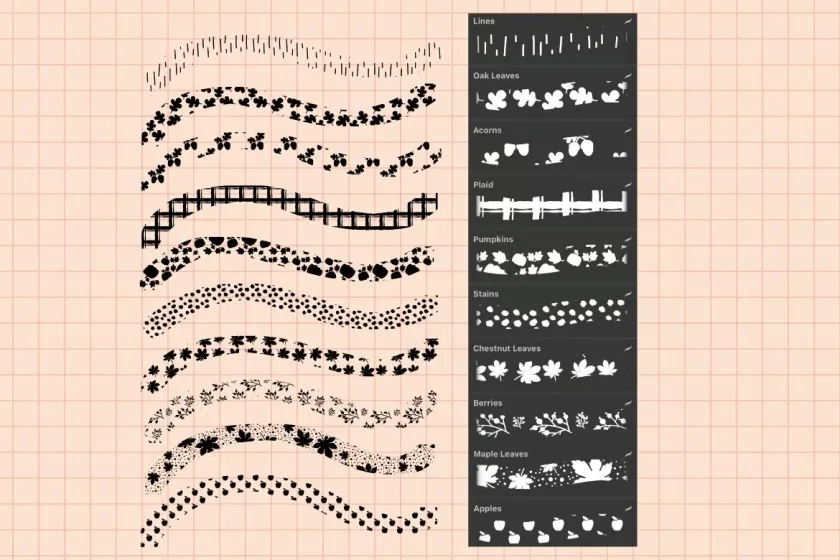 一套 10 个用于 Procreate 的手绘图案画笔。秋季加法。使用这些画笔,您可以在 Procreate 中轻松绘制无缝图案。如果您进行数字规划或子弹日记,您可以使用画笔创建数字纸胶带或便签。