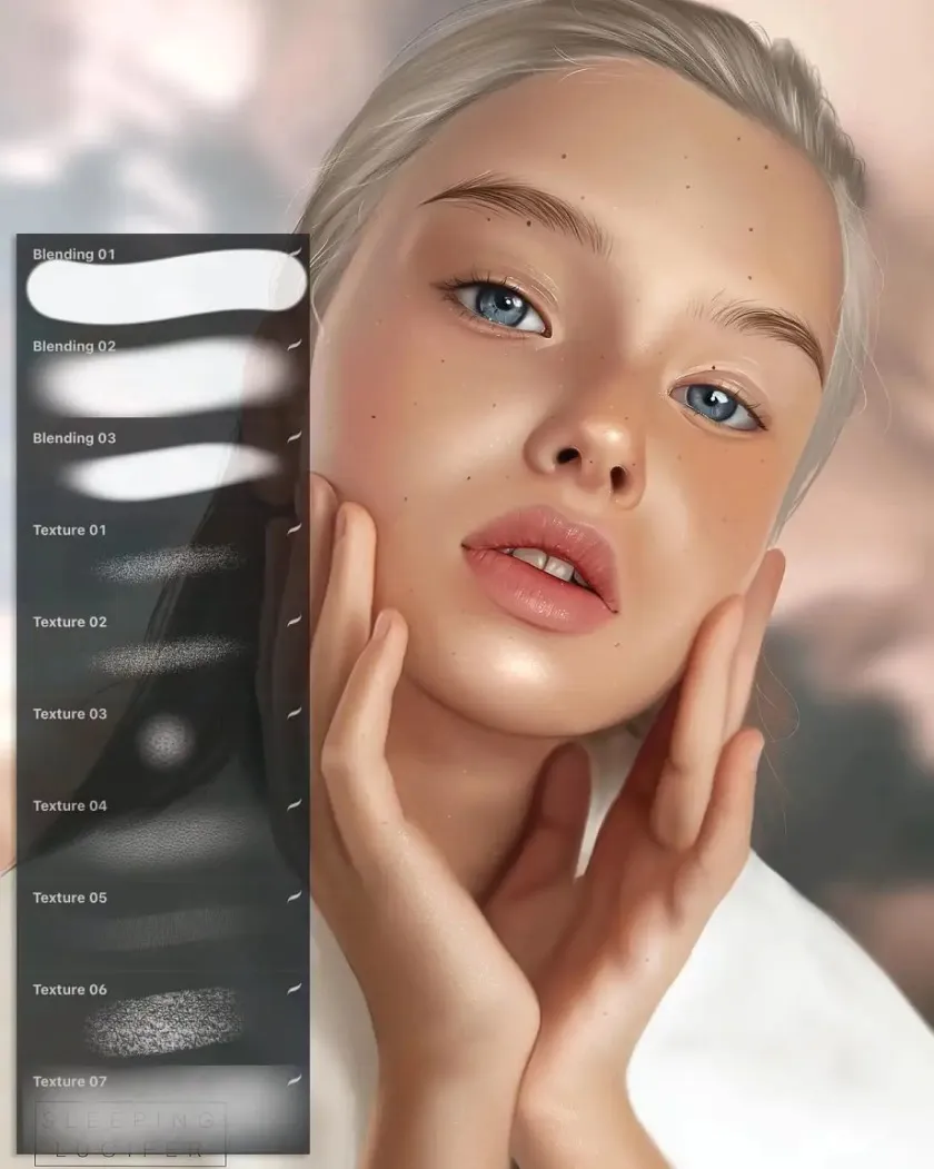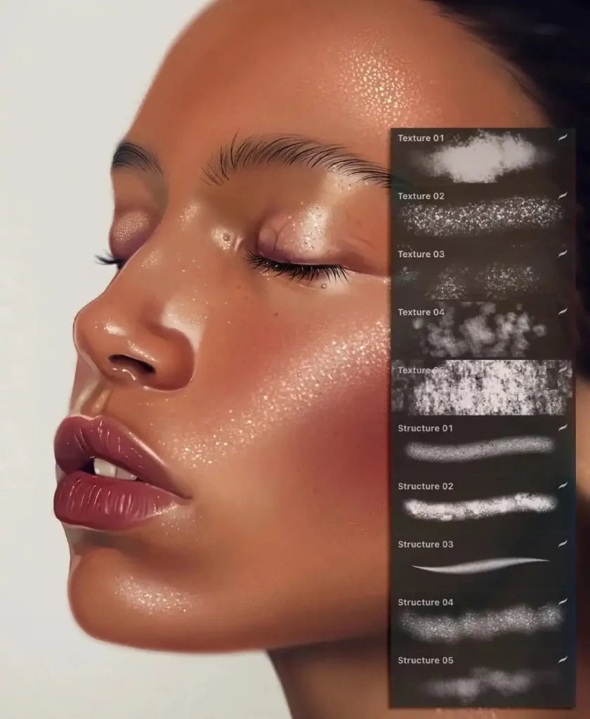 ? 930 + 画笔帮助你画肖像。为您的肖像添加闪光、皮肤纹理和妆容,节省时间!