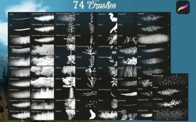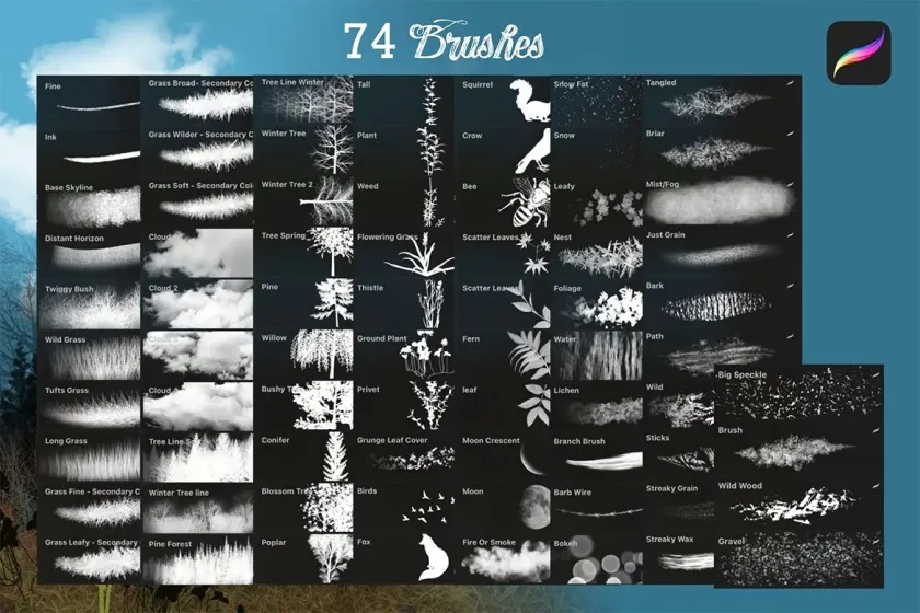 Procreate 的景观创建工具包。有多达 74 种画笔,它们混合搭配在一起,创造出非常简单的风景、森林和林地效果。
