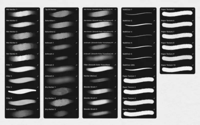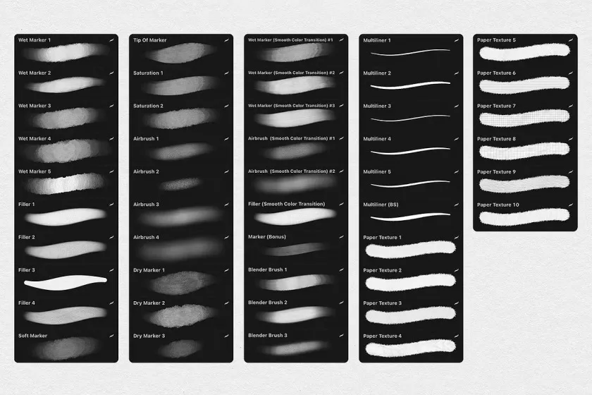使用这些画笔让你的插图更加大气!该套装具有多种画笔类型,例如填充剂、湿记号笔、喷枪、笔尖、软刷、饱和刷、干记号笔、搅拌器、多线笔和纸张纹理。该套装共有 40 多种刷子,您一定会喜欢它们。