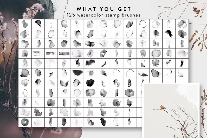 该合集包仅包含以下产品的画笔集文件(不包含 Photoshop 画笔、样式和 PNG 文件!!!):