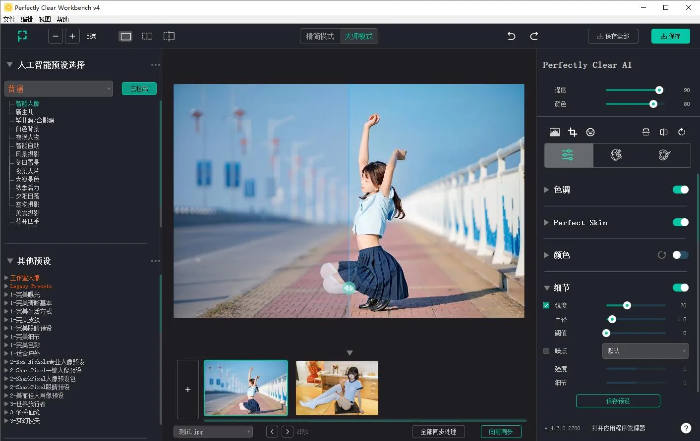 Perfectly Clear 集成了三项新的AI 图像增强创新: 1. AI 预设选择- 我们将使用 AI 分析图像内容、识别光照条件并对场景进行分类以应用最佳校正. 2. AI 图像增强- 在每年修正超过 510 亿张照片后,我们利用我们的知识创建了一个经过专业照片编辑训练的深度学习系统。 3. AI 肤色准确度- 我们的 AI 深度学习系统已经过全方位肤色训练,以确保完全准确。