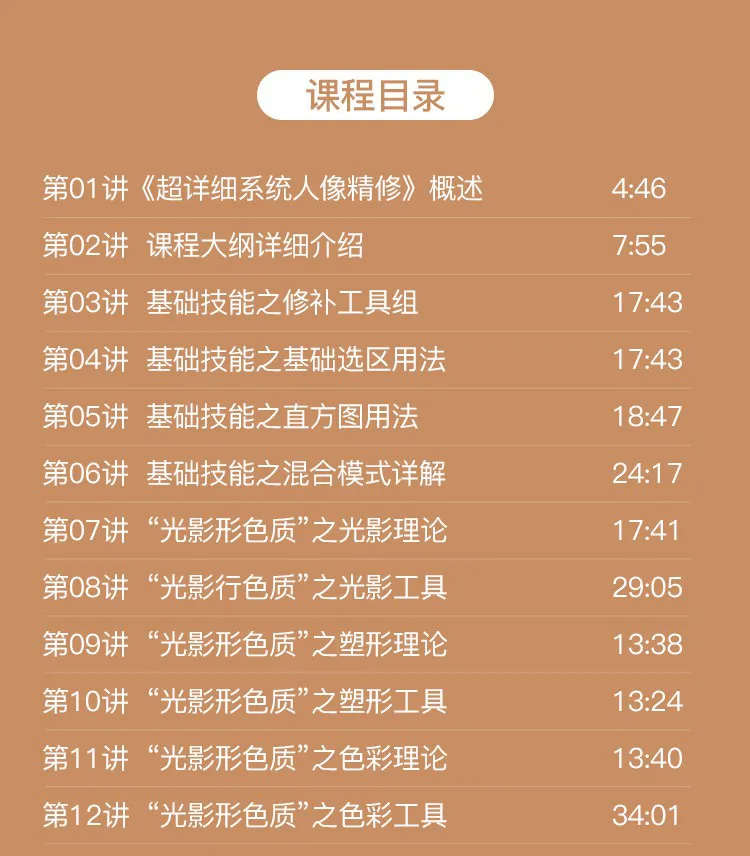 本视频教程是关于涛子商业人像精修超详细系统人像精修中文视频教程含素材,大小:28 GB ,格式:MP4高清视频,作者:涛子,共24章节,语言:中文。