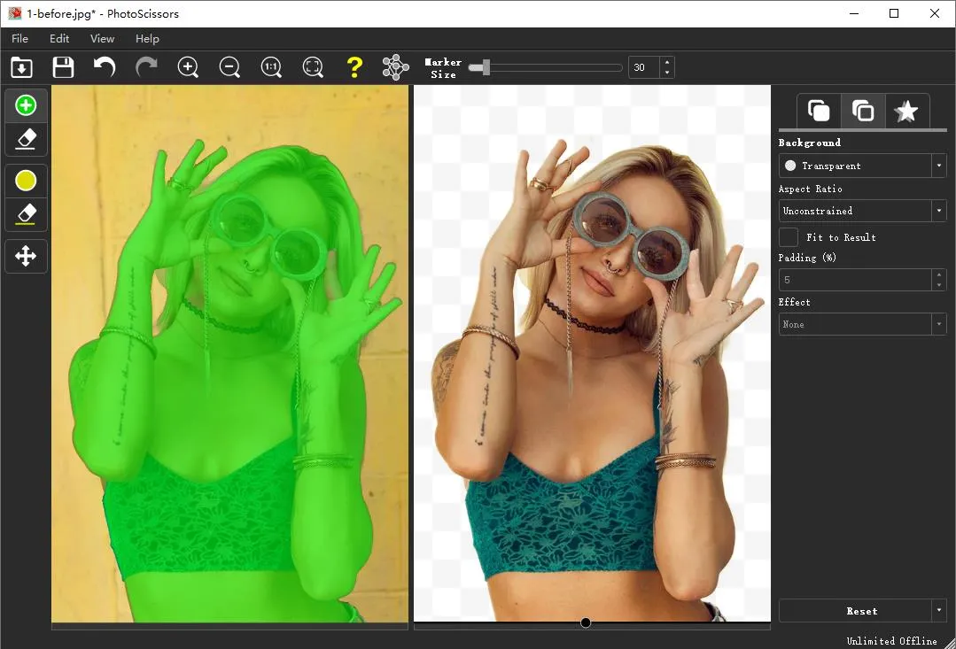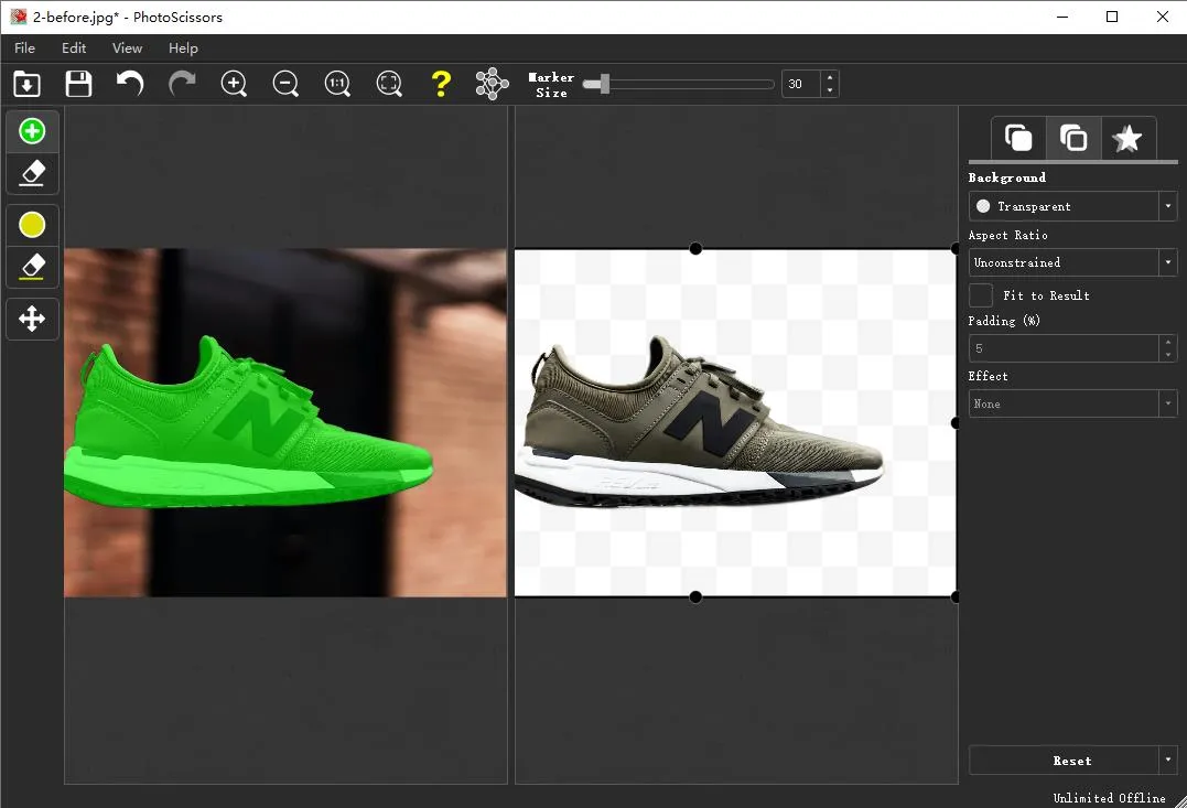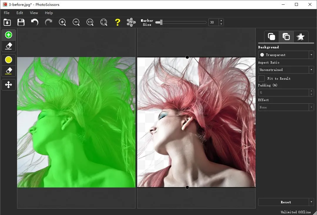 - 按颜色擦除背景:除了自动背景移除模式外,PhotoScissors 还提供了一种极其便捷的背景图像剪切方法,即通过按颜色分组功能进行剪切。您无需在繁琐的专业图形编辑器中使用套索工具或魔术棒工具精确地圈出区域,只需快速标记要剪切的区域和要保留的区域,程序即可自动完成剩下的工作。得益于对剪切边缘的优化分析,您无需费力寻找像素来选择不需要的背景。