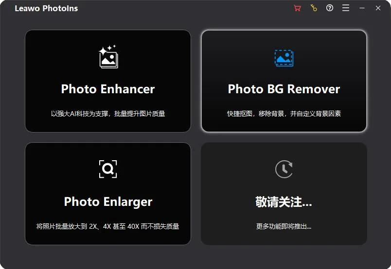 PhotoIns 是一款由 Leawo 开发的AI 智能照片增强工具,专注于修复、优化和提升数码照片质量。主要功能包括:一键抠图、修复模糊/低分辨率照片、AI 降噪、老照片修复、黑白照片上色、人像美颜优化、AI自动放大增强等。支持批量处理,操作简单,可一键提升 JPEG/PNG 等常见格式的图片清晰度与色彩表现。适用于摄影爱好者、家谱修复者或需要处理历史影像资料的群体。PhotoIns 主要有以下三个核心模块:
