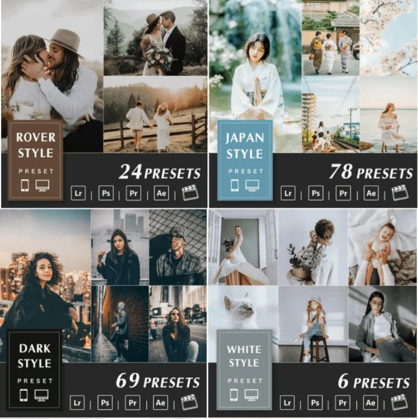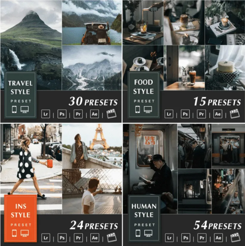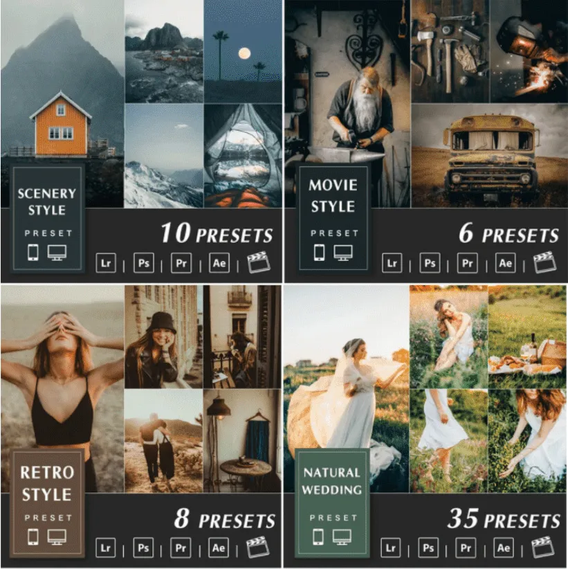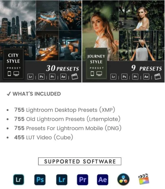 提供 Lightroom 预设和视频 Luts,可与最流行的视频和照片编辑软件一起使用: