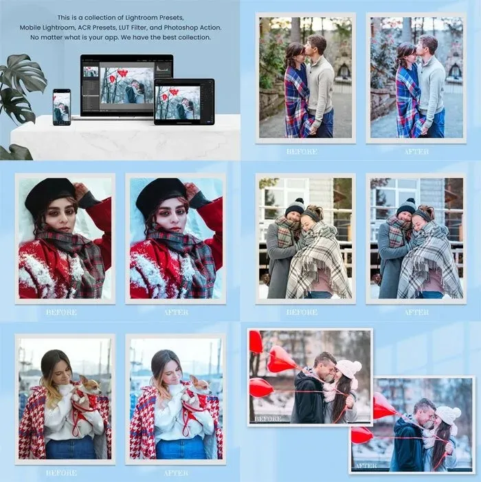 10 个冰岛照片预设包包含 Lightroom 桌面预设、移动预设、Photoshop 预设、Photoshop 动作和电影 LUT 预设。这个照片滤镜包为您的户外照片添加了蓝色、橙色、明亮、冬季和舒适的色调。这些摄影滤镜最适合冬季照片、圣诞照片、十二月主题、生活方式、时尚、婚礼、旅游博主、影响者、假期和活动、Instagram Blogger 滤镜、假期、街头风格、雪景和全家福摄影。