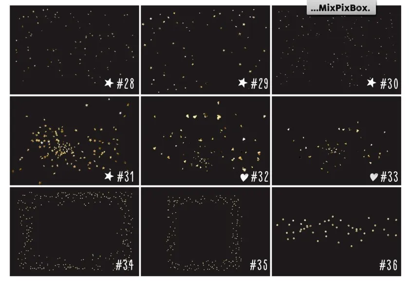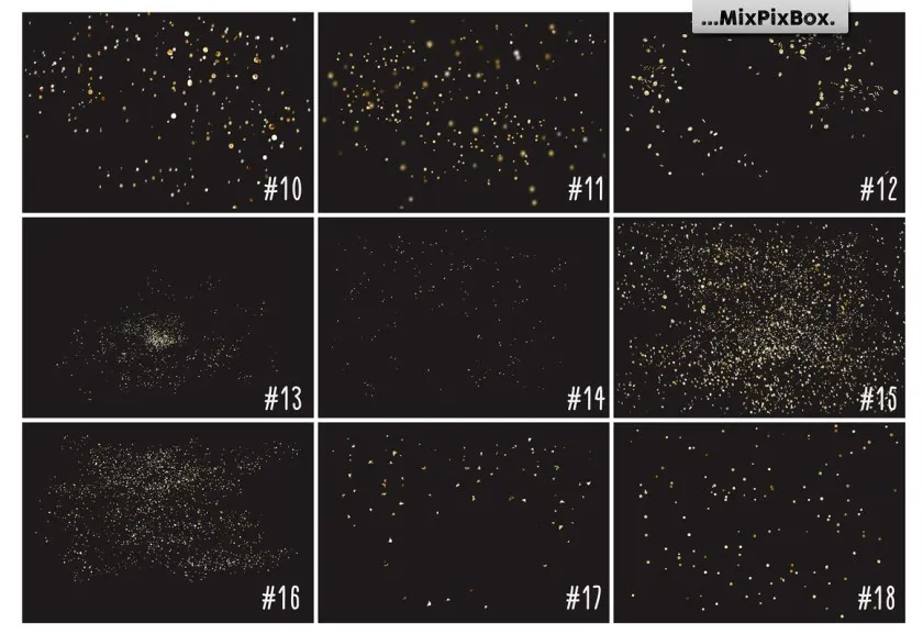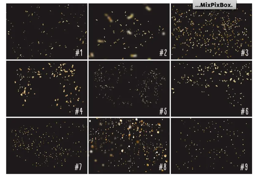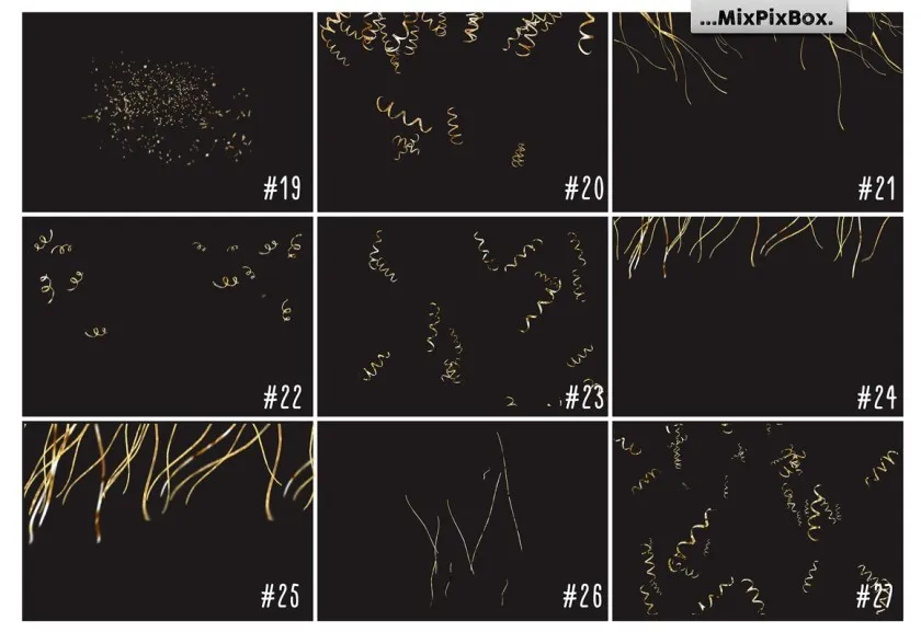 创造五颜六色的五彩纸屑雨来营造欢乐的画面氛围是完美的吗?没问题!使用这 36 张带有闪亮五彩纸屑的彩色图片,并将它们放在您的照片上。在软件兼容和高分辨率的 PNG 文件中,金色的漩涡在透明的背景下飘动,因此您无需购买任何东西,只需添加这种喧嚣。