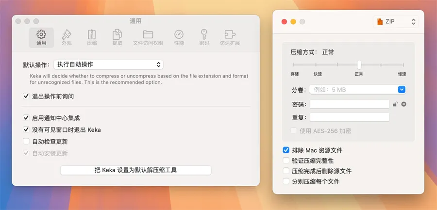 Keka 是 macOS 平台上一款轻巧高效的压缩与解压工具,以简洁界面与广泛格式支持著称。它支持创建和解压包括 7Z、ZIP、TAR、GZ、BZ2、XZ、ISO、RAR、LZMA 等多种主流压缩文件格式,并且完美融入 macOS 系统。相比系统自带解压工具功能有限,Keka 为用户提供了更强的文件打包与加密控制能力,是日常办公、软件管理与文件归档的理想选择。
