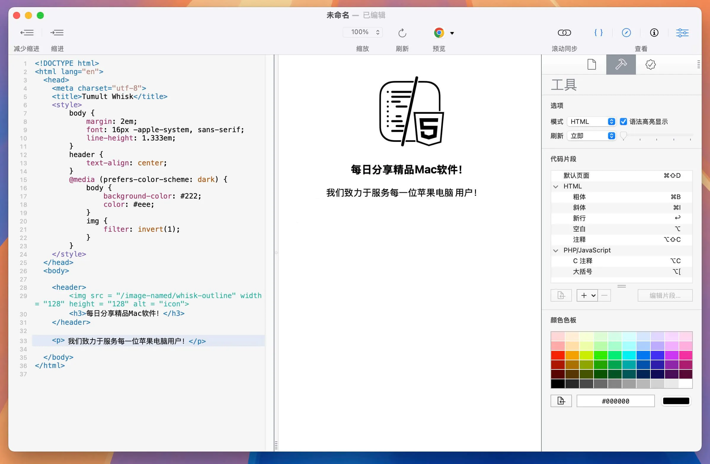 Whisk 是一款为Mac用户量身打造的HTML和PHP实时预览编辑器,旨在提升网页开发与前端设计的效率。它通过双栏视图将代码编辑与网页渲染结合在一起,用户在编写代码的同时即可看到实时效果,极大地缩短了调试和测试周期。Whisk 支持HTML、PHP、CSS 和 JavaScript,提供语法高亮、代码折叠和自动缩进等功能,是一款轻量级但功能完整的网页开发工具。Mac版特别优化了对macOS系统的界面布局与文件系统交互,适合开发者日常使用和原型设计。