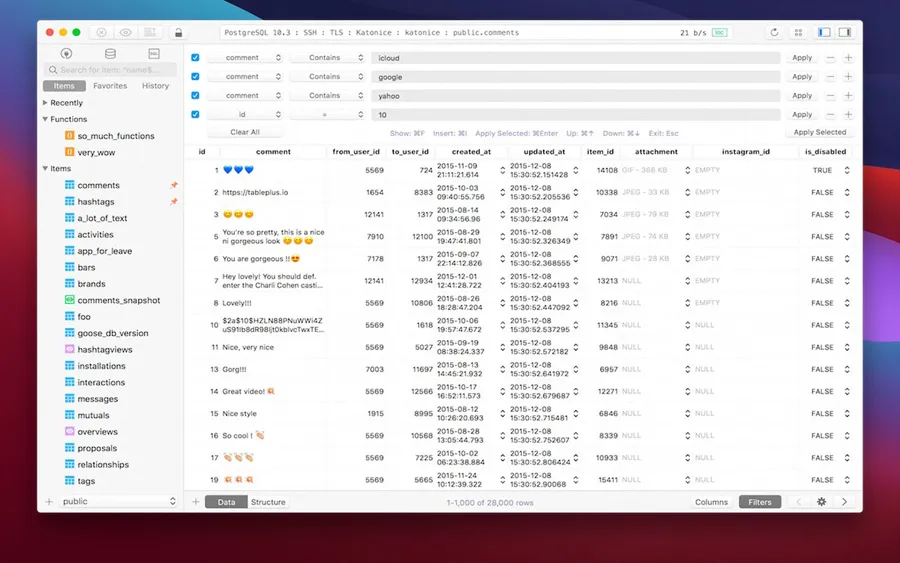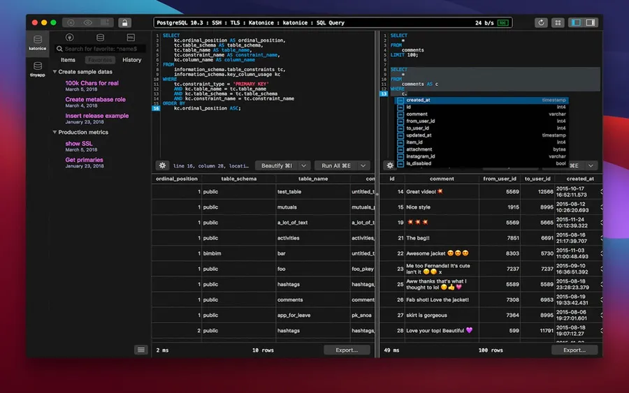 TablePlus 专为管理一组标准 SQL 格式(包括 PostgreSQL、MySQL 和 SQLite)而构建,可与您一起成长,允许您根据需要添加新的插件和驱动程序。该应用程序简单而简约,但仍然具有完成任何任务的能力和灵活性。