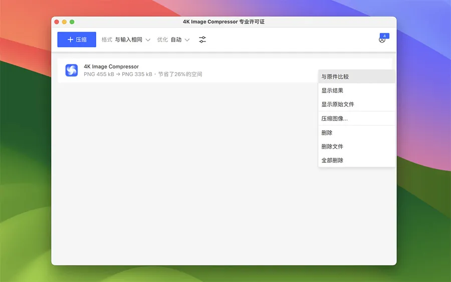 4K Image Compressor Pro 是一款专为 Mac 用户设计的图像压缩工具,旨在帮助用户高效地压缩和优化高分辨率图像。随着4K和更高分辨率图像的普及,文件大小的增大给存储和传输带来了挑战。4K Image Compressor Pro 提供了一种简便而强大的解决方案,通过先进的压缩算法,有效减少图像文件的大小,同时保持图像的高质量。