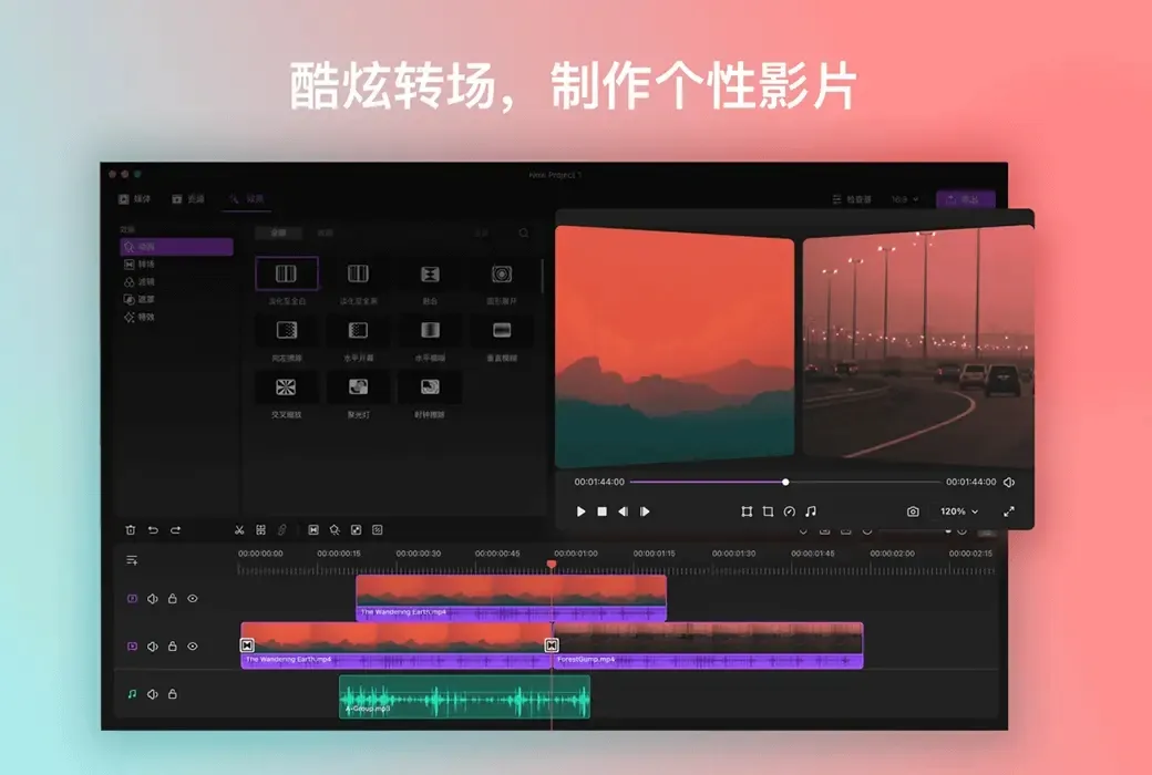 - 轨道间无缝衔接。随心添加视频轨道,添加过渡,并在轨道之间自由地移动素材。