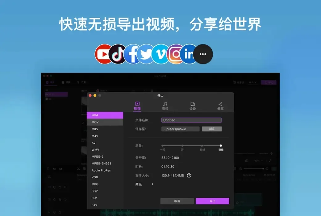 - 创建尺寸比例为16:9、9:16、1:1、4:3、21:9的视频项目,导出后将成果上传到B站、YouTube等社交平台。