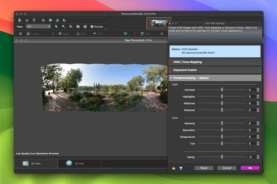 该软件提供了丰富的图像预览和调整功能。用户可以预览图像,放大或缩小,将图像旋转到不同角度,裁剪照片,应用蒙版,以及检查图像信息(如文件名、文件类型、大小、颜色深度和配置文件)。此外,用户还可以通过设置与焦距、相机和镜头相关的参数,应用渐晕校正,并选择投影模式(如圆柱形或球形)来对齐图像。软件支持自动校正和调整模式,用户也可以手动调整亮度、调整全景图大小、增强图像质量以及插入链接。