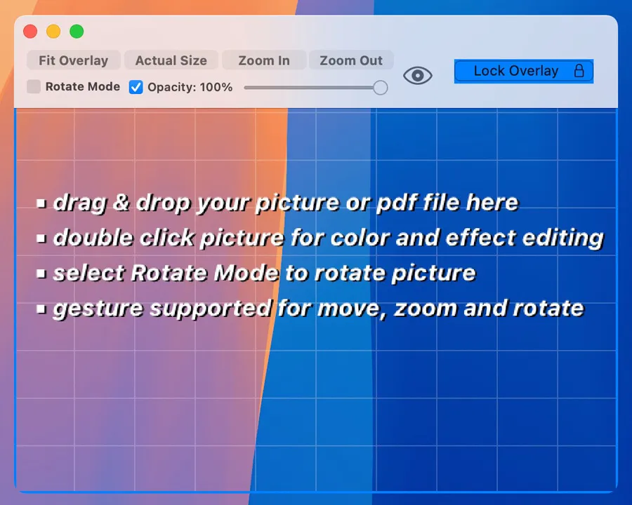 Overlay 安装便捷,上手几乎零学习成本。启动后图层即悬浮于桌面,支持任意拖动、缩放及透明度调节,整合在菜单栏中的控制面板清晰直观。最令人惊喜的是“点击穿透”功能,让你在图层悬浮状态下无障碍操作其他应用,极大提升了工作流流畅度。界面设计紧贴 macOS 风格,无打扰广告、无多余动画,整款软件干净利落、专注于本职,给人一种极致的“工具感”。