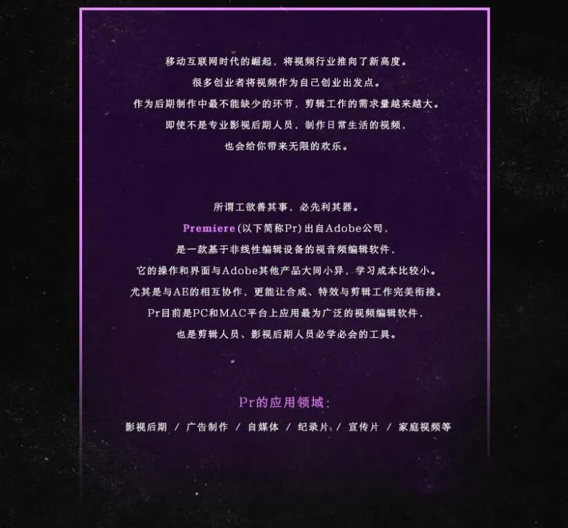 本PR教程是关于Pr全流程剪辑课程中文视频教程 主讲老师郭术生,时长:4小时42分钟,大小:1.48 GB ,高清视频格式,作者:郭术生,共2章节,语言:中文。