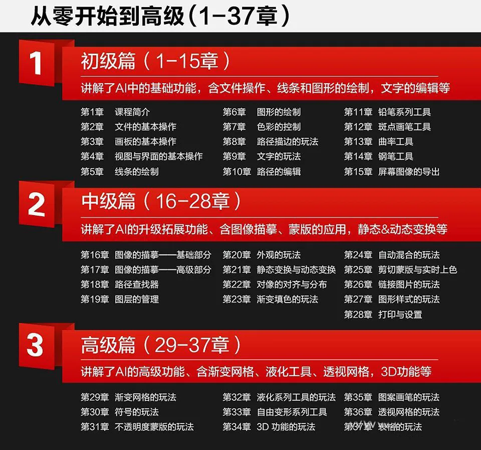 1、讲解AI的各项功能,共分为初级篇、中级篇、高级篇3大篇章。