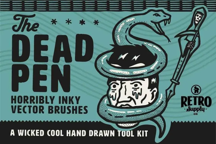 62支手绘插画散点图案精细线条水墨艺术Ai矢量笔刷 Retro Supply – The Dead Pen Brush Pack
