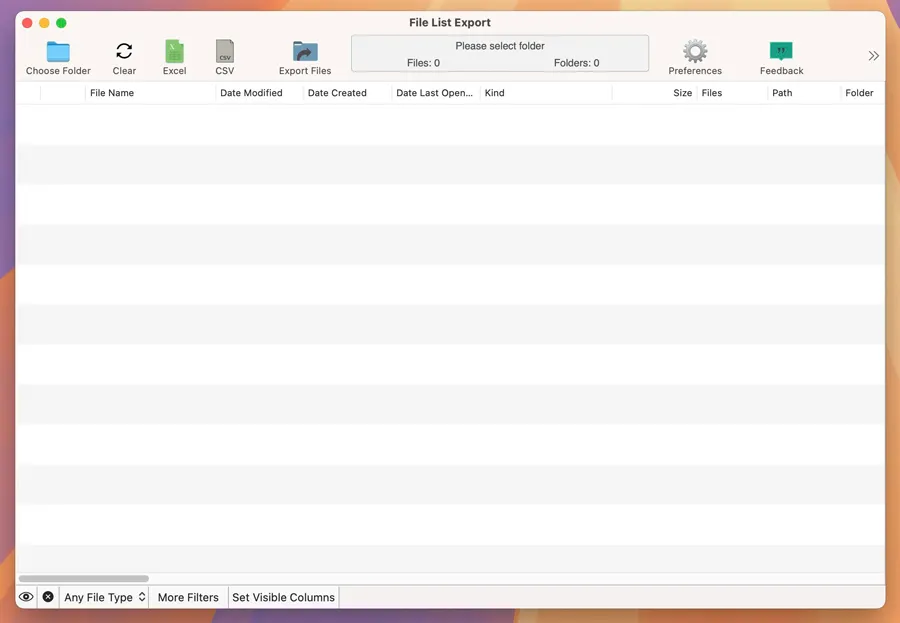 在 Mac 上使用 File List Export 是一种非常顺畅的体验。打开应用后只需选择目标文件夹,软件便自动快速扫描其内所有子文件夹和文件,速度极快且支持实时预览。整个界面采用原生 macOS 风格设计,布局清晰,按钮易懂,哪怕是初次使用也能轻松上手。Mac 版不仅支持深色模式,还对 Retina 显示屏进行了适配,列表细节清晰可读。在 M 系芯片设备上,面对包含上万文件的大型目录也能快速响应,几乎无卡顿,整体使用流畅、稳定、高效,令人非常安心。