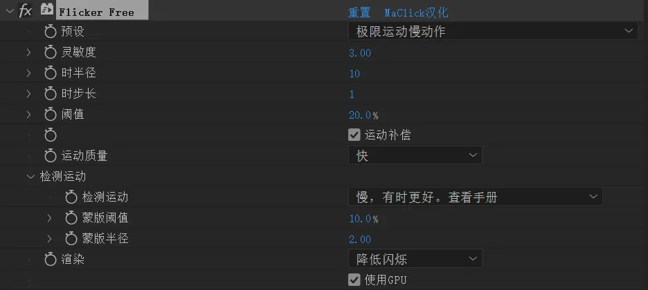 由于我们肉眼和摄像几捕捉的光线频率不一样,所以我们有时候用摄像机捕捉的视频会出现光闪烁的现象。Flicker Free插件能就能帮助我们弥补这一缺陷,能够很好的处理光闪烁的现象:光闪烁,延时拍摄闪烁,动态闪烁等。解决做延时摄影或拍摄慢动作(高帧速率)视频产生的闪光。同时这也是非常有效的去除LED灯,电脑显示器或当有电气干扰时产生的闪烁。插件从分析画面的颜色和亮度从而计算匹配出平滑的视频图像。支持4K, 支持GUP加速渲染。