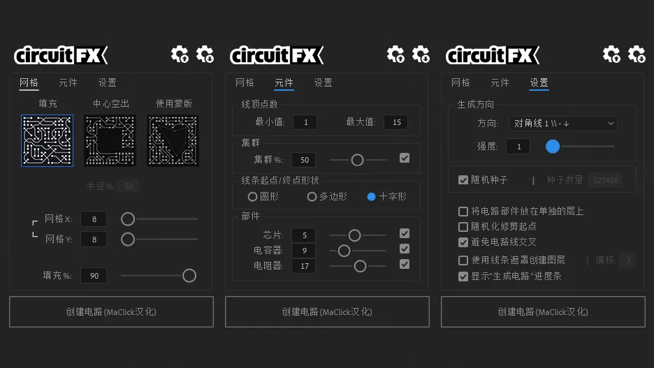 circuitFX 是 After Effects 的一个工具,用于创建图形电路板。每次按下按钮时都会随机生成电路图案。除了电路线和圆圈外,circuitFX 还可以创建芯片、电阻器和电容器。它能够将所有需要的部件放在一个形状层中,或者为电路板的每个部分创建单独的形状层。它非常适合技术或科幻相关项目、动画背景、HUD 等。