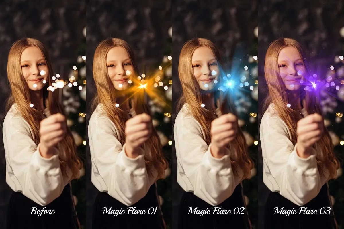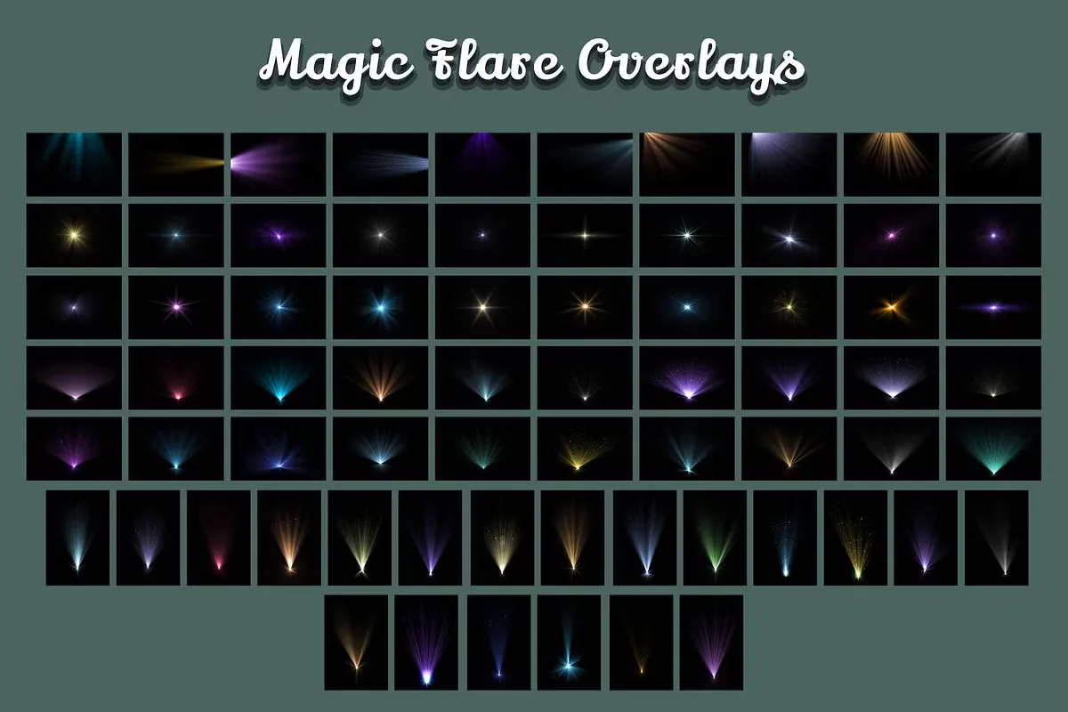 Magic Flare 叠加包由自然阳光耀斑、逼真的阳光轴和带闪光的数字透明礼品盒光束组成。