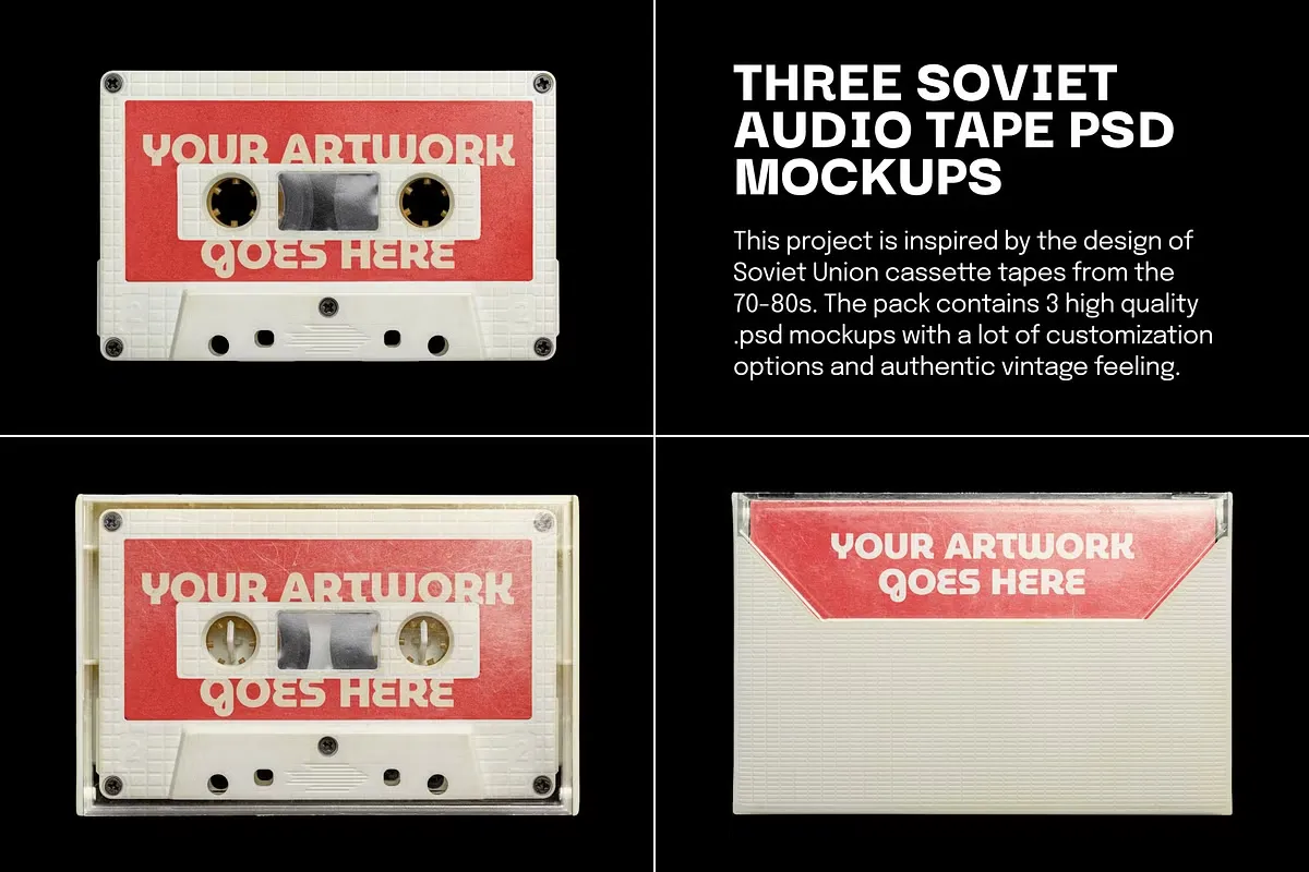 这个项目的灵感来自 70-80 年代苏联盒式磁带的设计。该包包含 3 个高质量的 .psd 模型,具有许多自定义选项和真实的复古感觉。您可以将您的设计应用于磁带标签和封面(J 卡)、更改磁带和外壳颜色、控制高光和阴影、使用任何背景。