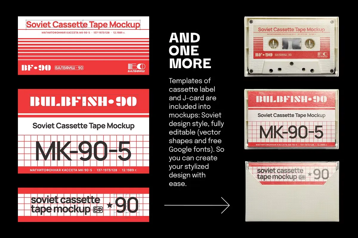 奖励 3 /磁带标签和 J 卡模板包含在模型中:苏联设计风格,完全可编辑(矢量形状和免费谷歌字体)。所以您可以轻松创建您的程式化设计