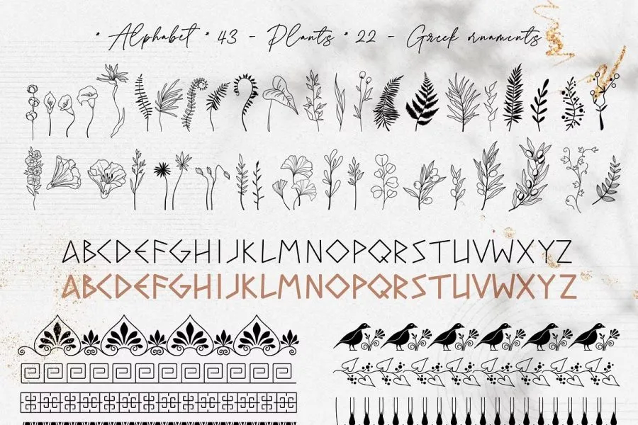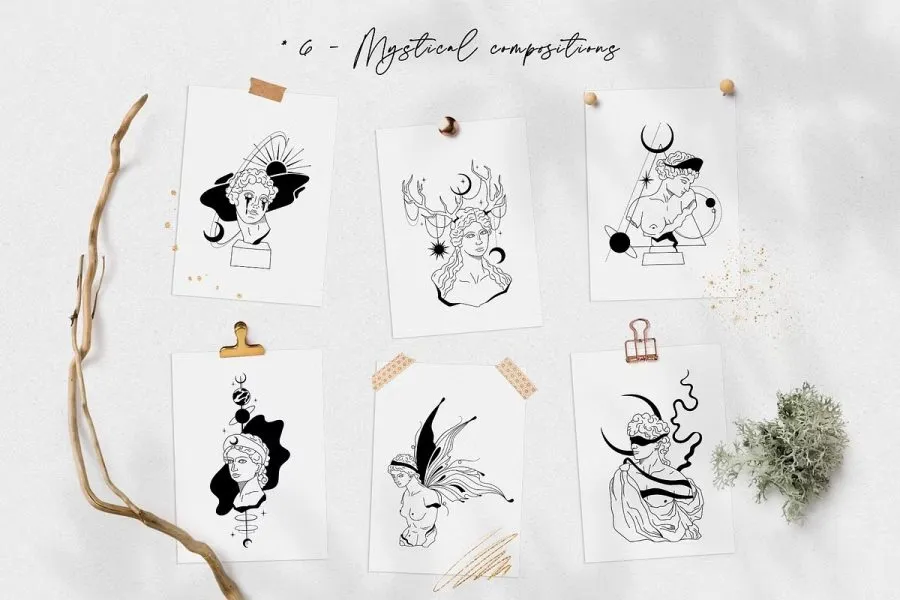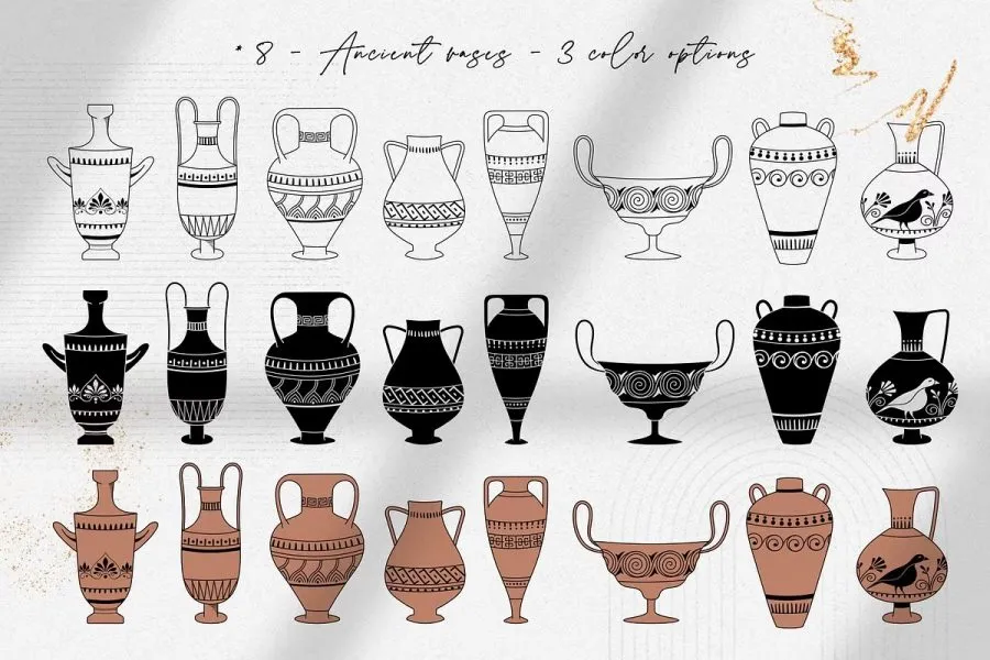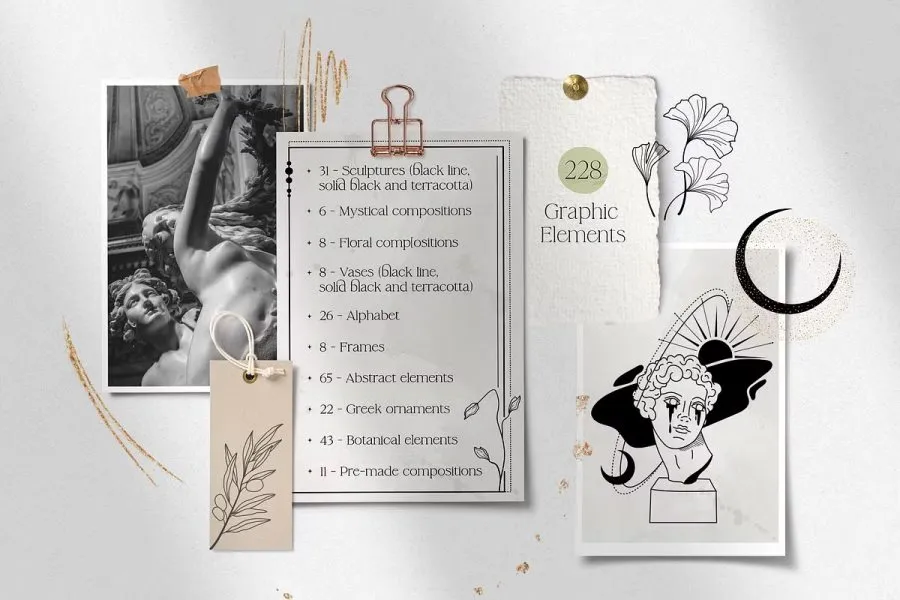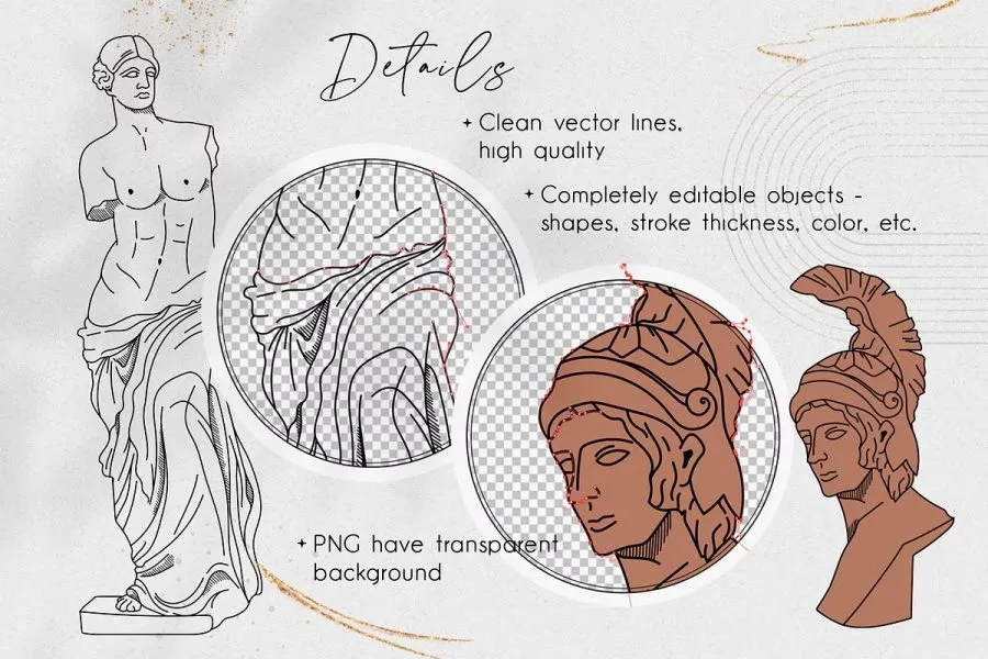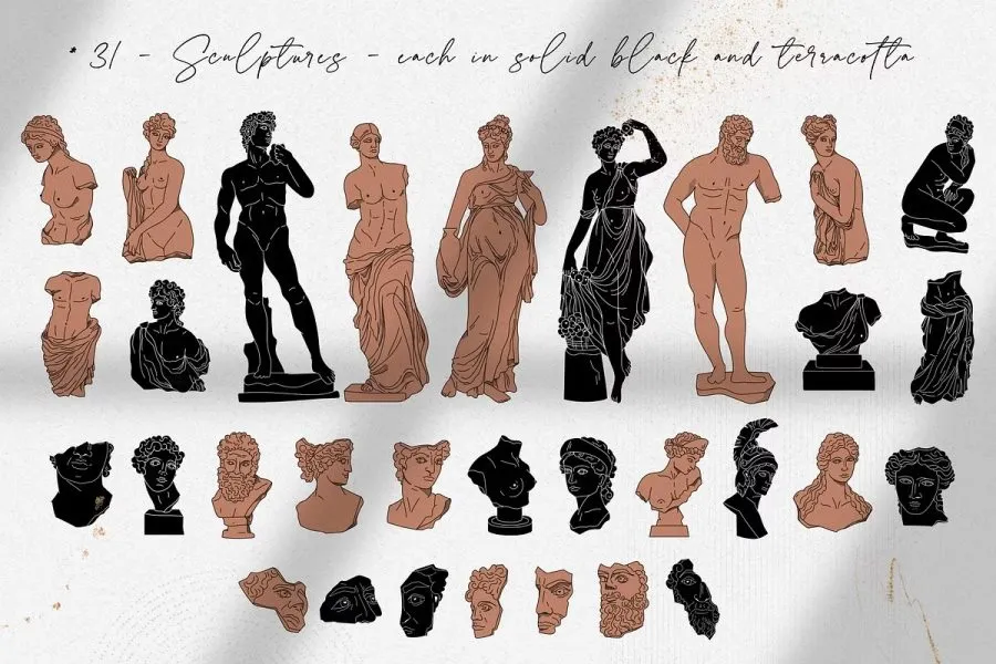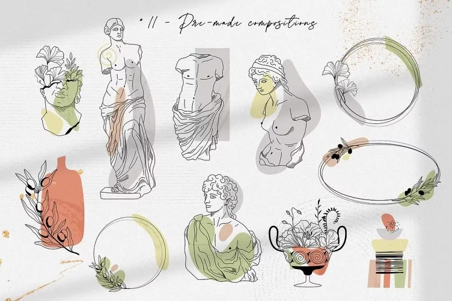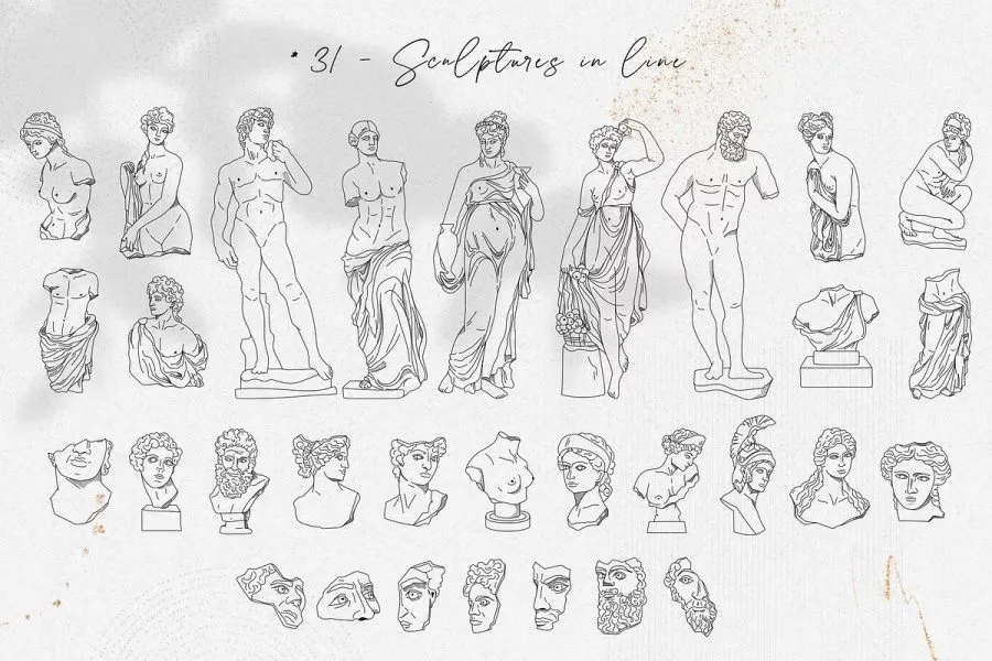 228张古希腊神话英雄人物雕像装饰饰极简艺术手绘线描插画AI矢量设计素材 Antique greek beauty – designs kit