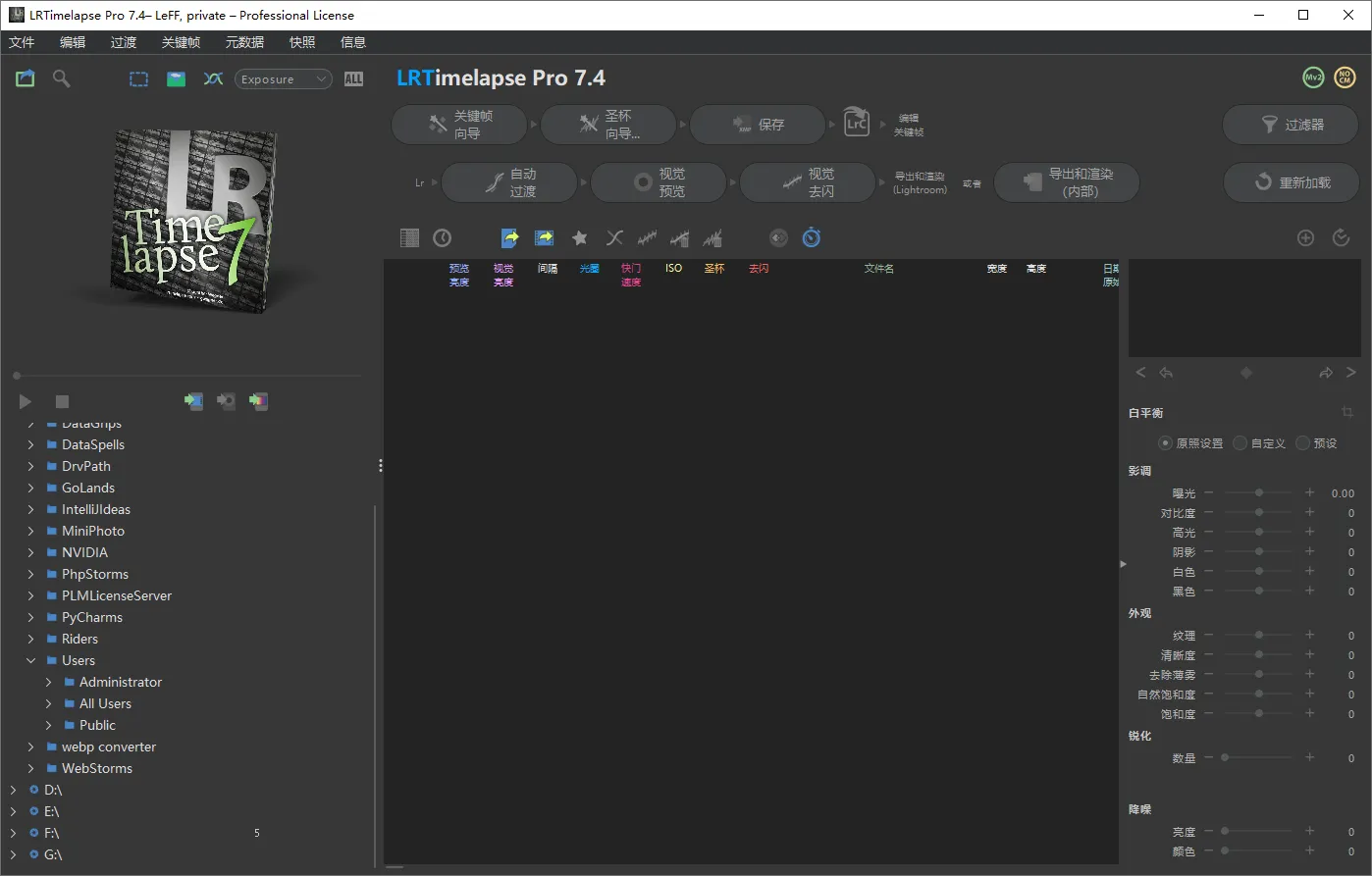 LRTimelapse Pro 是一款专业的延迟摄影编辑渲染工具,具有高清输出、简单易用、无缝转换等特点,程序可以配合 Adobe Lightroom,Adobe Camera RAW 和 Adobe After Effects 等程序完美配合使用用来制作延时摄影, 可以做到平衡曝光不一致( 去除闪烁等现象)关键帧参数自动过渡的功能。是非常强大的一款延迟摄影工具! LRTimelapse Pro可以将您的影片提升一个水准。此外,LRTimelapse Pro 也是为你的延时电影抗闪烁的最好的工具之一。