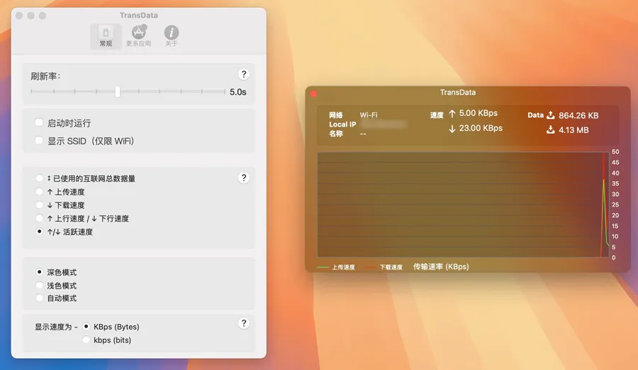 TransData 是一款专为 macOS 用户打造的实时网络流量监测与速度追踪工具,旨在通过状态栏形式展示当前网络上传与下载速率、数据总量及连接状态等信息。它以极简的界面风格和低资源占用的特点,提供随时可见的网络使用概况,特别适合需要长期观察网络行为、掌握流量消耗或优化网络使用的用户。Mac 版 TransData 原生支持 Apple Silicon,完美兼容 macOS Ventura、Sonoma 等系统,是一款轻便、高效、实用性极强的网络监控小工具。
