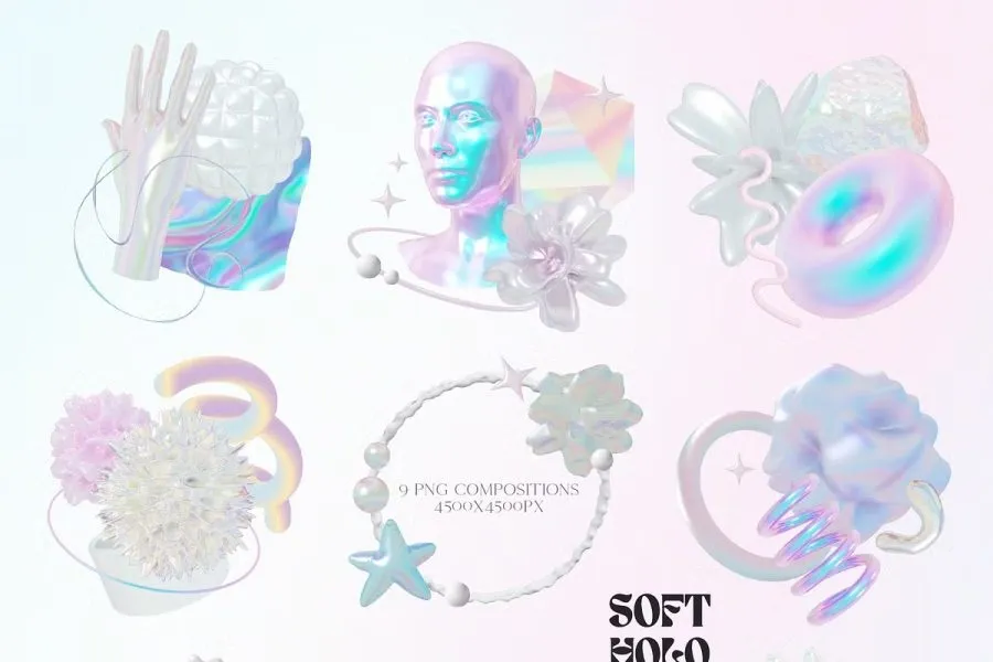 如果您想快速轻松地将全息趋势融入您的设计中,那么这款 3D 形状非常适合您!易于使用 – 每个图像都以 PNG 格式提供,因此您可以在您喜欢的每个图形软件中使用它们。
