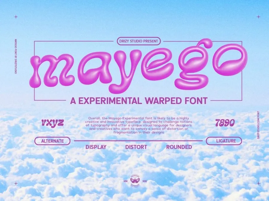 Mayego 是 Drizy Studio 推出的一款可爱的实验性扭曲字体。提供您的项目所需的俏皮奇妙风格。