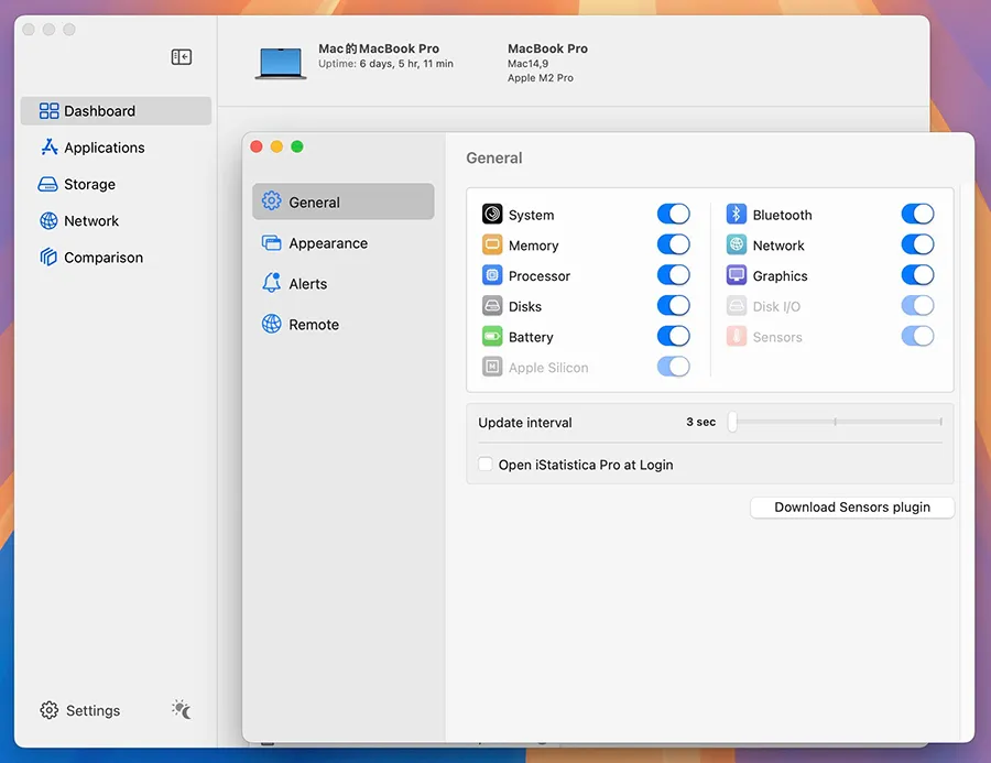 在 Mac 上使用 iStatistica Pro,你会发现它界面整洁清爽,启动迅速。菜单栏中的状态图标能即时显示关键资源(例如 CPU 占用、内存使用),而完整仪表板则能进一步深入查看各项指标。温度传感器与风扇信息在有相应插件支持的情况下也能显示,配合通知功能(当某项资源过载或温度异常时提醒),让你对机器状态的掌控感很强。它对 Intel 与 Apple Silicon 平台均有支持,运行流畅。