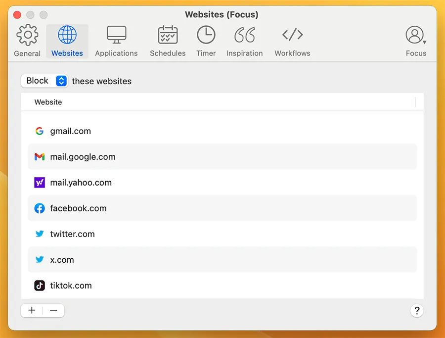 它支持你能想象到的各种网站屏蔽,从创建屏蔽特定网站的屏蔽列表,到屏蔽除少数白名单域外的整个互联网的允许网站。Focus甚至可以按关键字屏蔽网站。