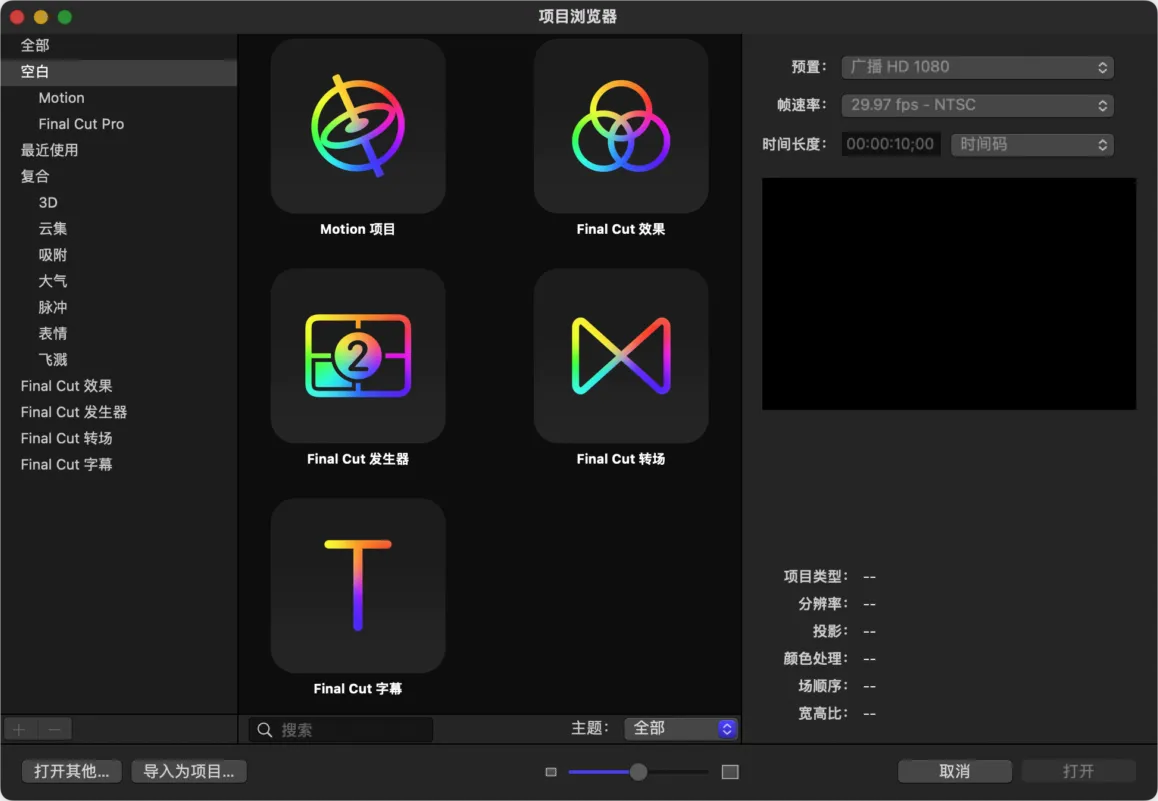 与 Final Cut Pro 集成:可将 Motion 项目直接导入 FCP,特效和动画无缝应用到剪辑中。