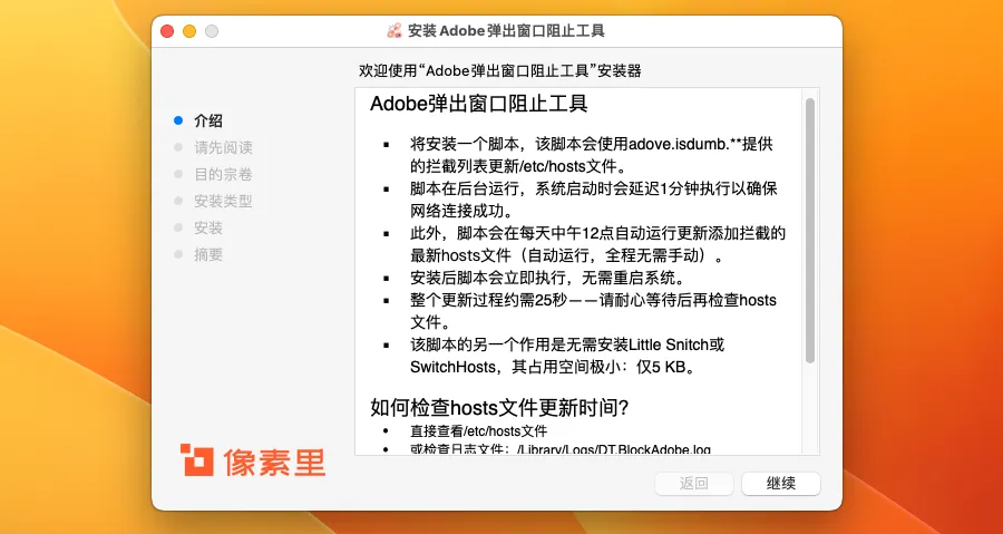 - 将安装一个脚本,该脚本会使用adove.isdumb.**提供的拦截列表更新/etc/hosts文件。