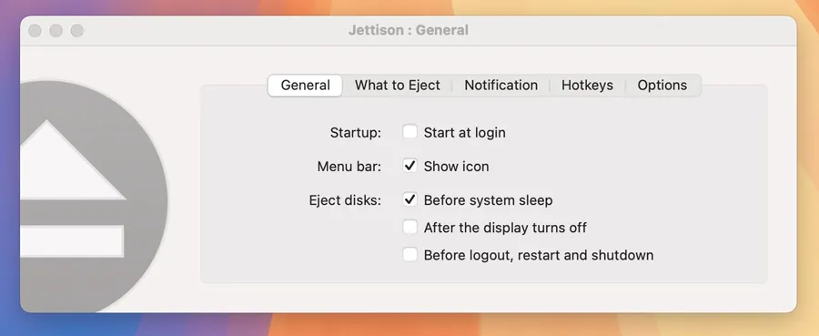 Jettison for Mac 是一款磁盘管理辅助工具,国内用户多称为“弹出工具”或简称为“Jettison”。它专注于“安全卸载外接磁盘”并在恢复供电后自动重新挂载,适用于移动硬盘、USB 设备、SD 卡和网络共享卷。Jettison Mac 版本完美适配 Apple Silicon 与 Intel 架构,兼容最新 macOS 系统,适合注重磁盘安全与自动化操作的用户群体。