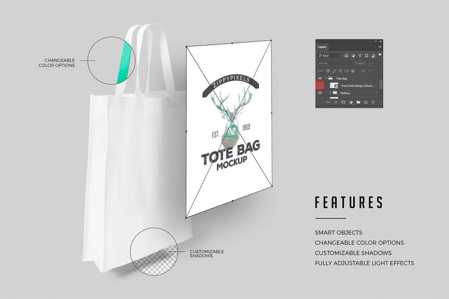 - 手提袋模型:展示 4 个令人惊叹的手提袋模型,帮助您以最佳方式展示您的品牌、包装或徽标设计。您还可以自定义设计、阴影、纹理效果、颜色和背景。