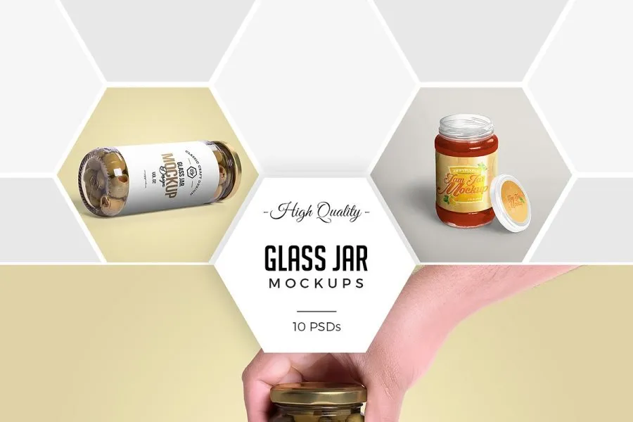 - 橄榄玻璃罐模型:查看这些优质玻璃罐模型,以令人惊叹和专业的方式展示您的橄榄包装设计。提供 5 个 PSD 来展示包装罐的每一个细节。您可以在罐子的盖子和正面标签上展示您的设计。