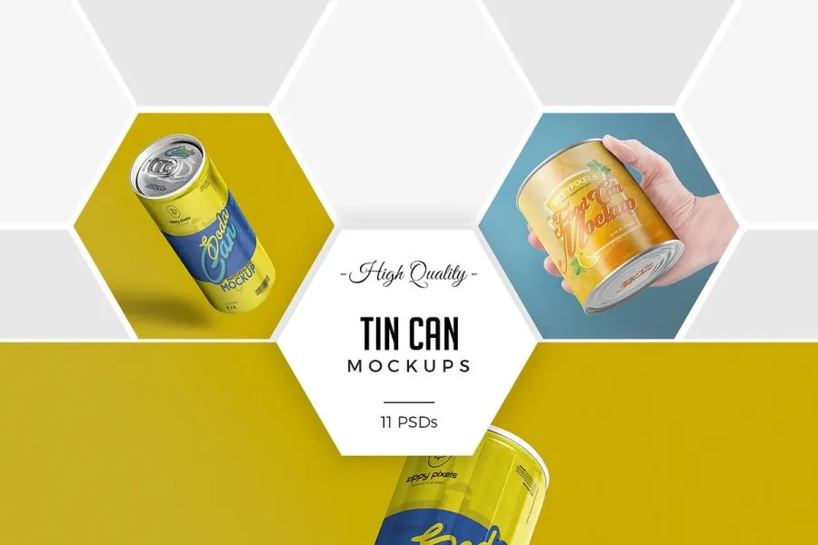 - 罐头包装模型:这些食品罐头包装模型提供 5 个具有不同风格和姿势的 PSD,以真实地展示您的包装、品牌和产品标签设计。具有正面、底部和顶部设计选项以及可定制的阴影和背景。
