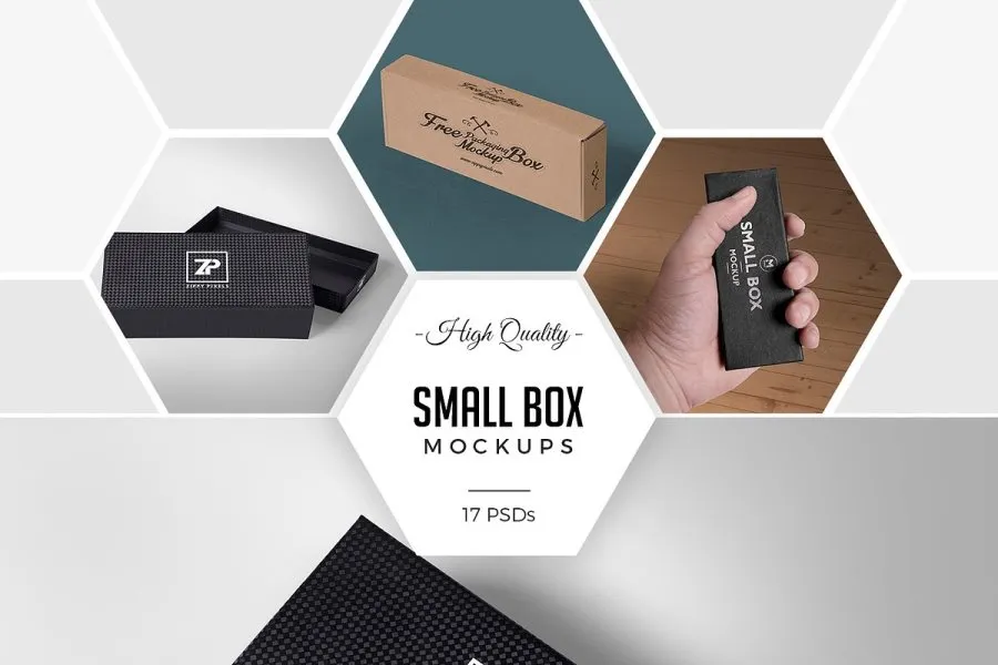- 小盒子模型:5个黑色矩形盒子模型,用于在盒子的正面和顶部展示您的徽标和品牌设计。您还可以根据您的选择调整阴影、效果和木质背景。