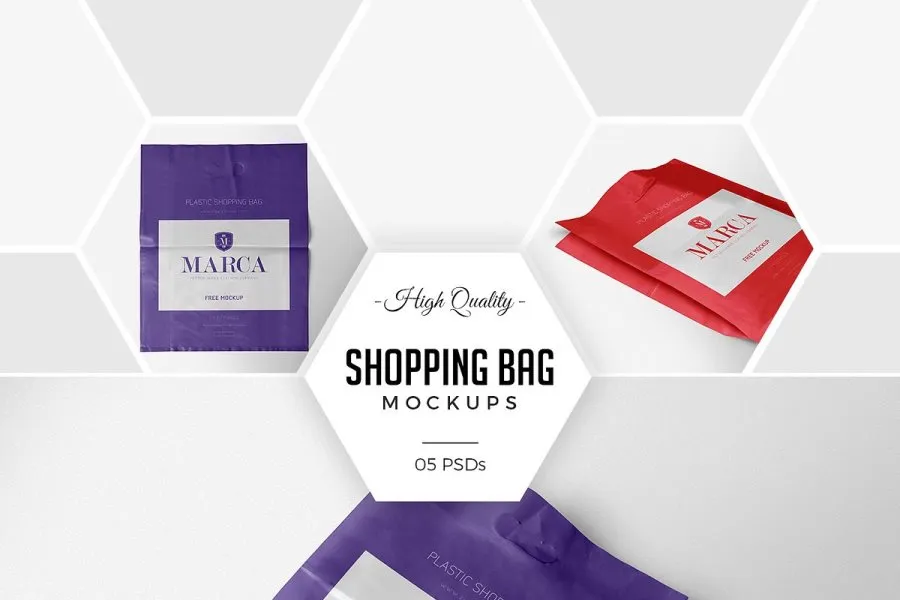 - 购物袋模型:五个优质塑料购物袋模型,非常适合展示您的商品、品牌或包装设计。这些令人惊叹的模型具有多种定制选项,例如可变的设计、颜色、效果和背景。