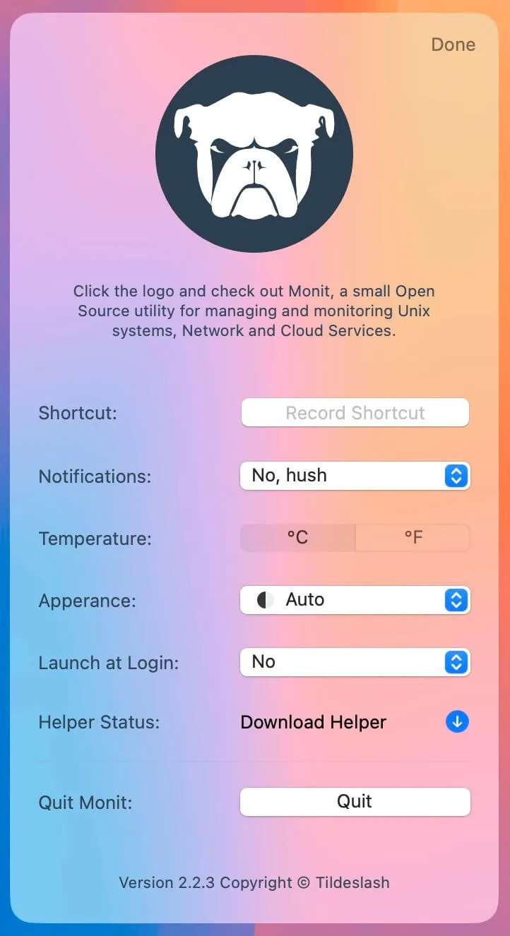 Monit 中文一般称为“系统监控工具 Monit”,是一款专为 macOS 打造的轻量级系统状态查看软件。它能够在菜单栏中实时显示 CPU 占用、内存使用、磁盘读写、网络速度和电池状态等关键数据,让用户随时掌握 Mac 的运行状况。Monit 设计简洁,不会占用过多系统资源,特别适合需要关注性能的程序员、设计师以及经常运行大型任务的用户。在 Mac 平台上,它的菜单栏集成与通知提醒功能尤为突出,使用体验自然流畅。