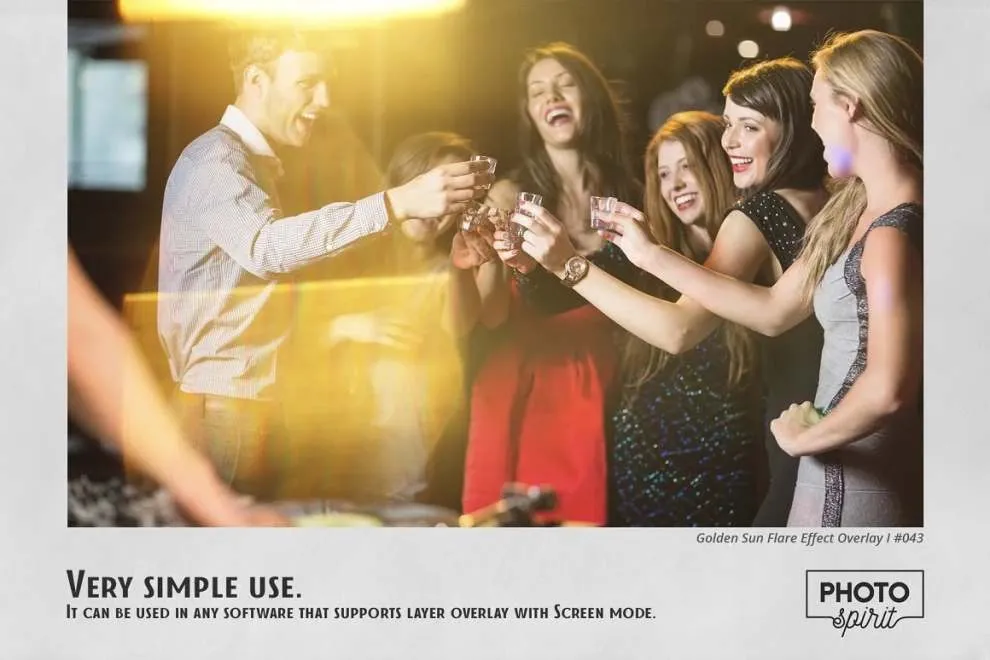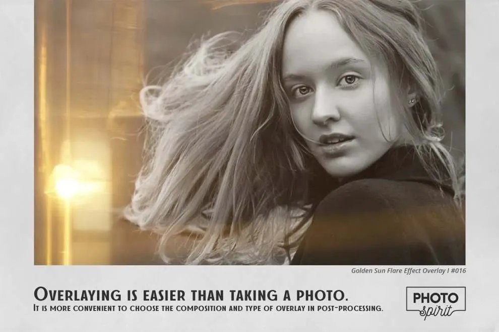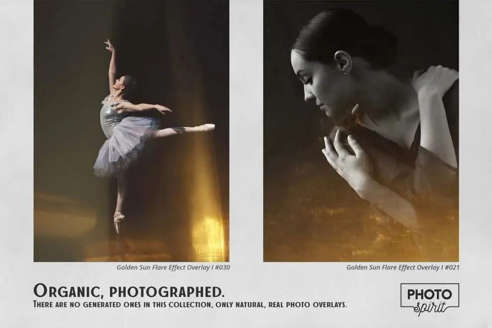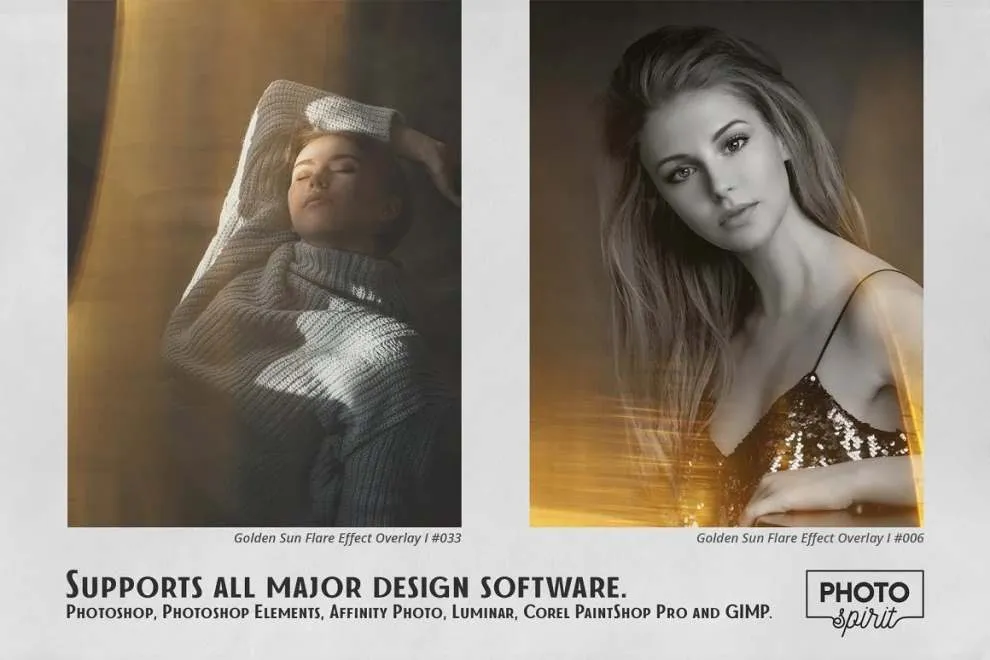 适合业余爱好者和专业人士。彩色和黑白照片效果极佳。为方便起见,添加了用于在屏幕模式中选择和覆盖叠加层的操作。这将适用于 Photoshop 和 Photoshop Elements。Golden Sun Flare 叠加可用于任何支持屏幕模式下的图层叠加的图形编辑器。