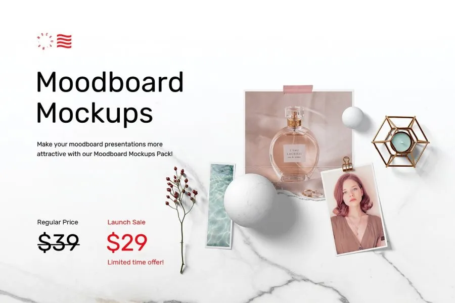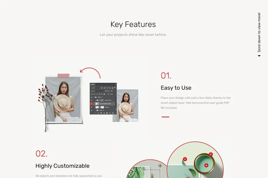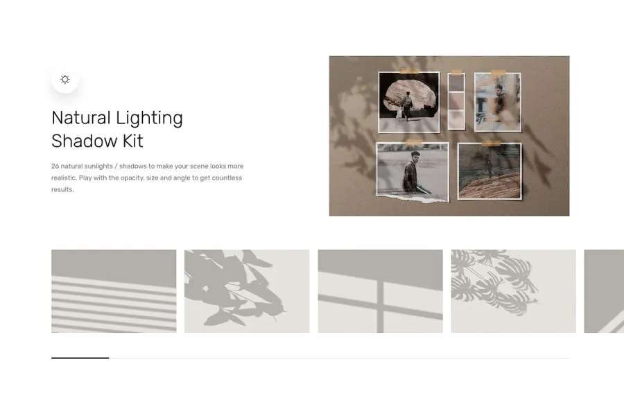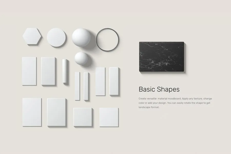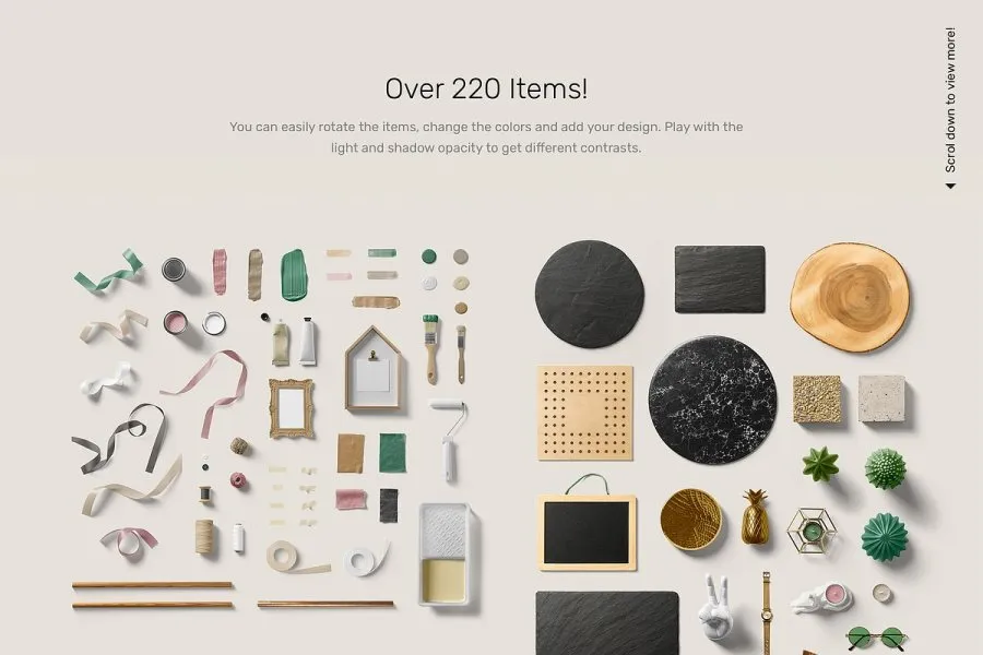 使用我们的情绪板模型场景创建器让您的情绪板演示更具吸引力。您可以轻松旋转项目、更改颜色并添加您的设计。调整光线和阴影的不透明度以获得不同的对比度。为了给您一个更好的开始,我们精心制作了一些可供使用的预制场景。只需将设计替换到智能对象层中,点击保存即可完成。该包带有 26 种自然阳光/阴影,使您的场景看起来更加真实。